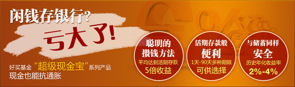 好买基金研究中心精选市场上业绩优秀的货币基金、短期理财基金,推出“超级现金宝”短期现金管理工具。市场低迷时期,“超级现金宝”使你的资金不必躺在银行里贬值,轻松获取3.5%左右年收益,战胜通胀,保值财富!