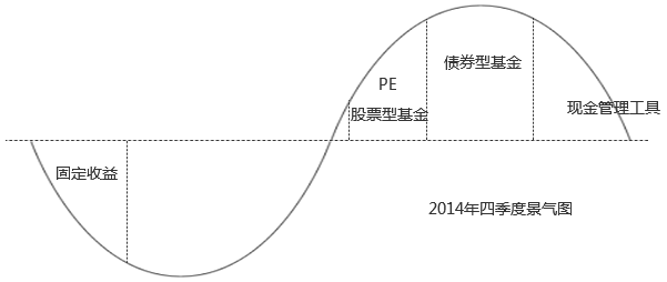至于四季度的配置,正如上面2014年四季度景气图所示,我们依然认为:权益类资产仍是最值得投的资产,而债券也会是好时候,但绝对收益较低。相应的,PE\VC、定增类产品也是投资的黄金期,而现金管理产品,如货币基金、宝类产品仍有相应的价值,但相比前期重要性在下降。
