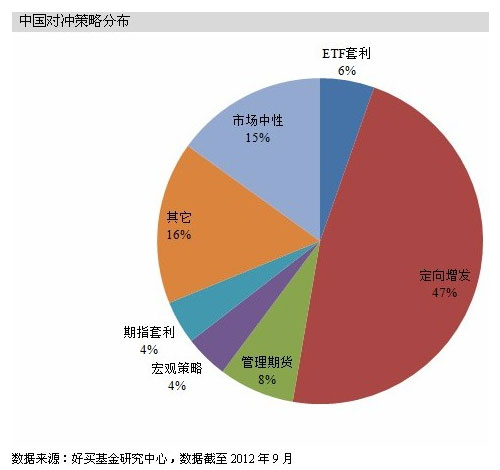 随着中国金融市场的创新正在大步迈进,对冲策略在中国越来越普及,产品线越来越丰富,投资者对于这类产品的认知和接受程度也越来越高。根据好买基金研究中心不完全统计,目前相对比较多的对冲策略是定向增发、市场中性、宏观策略、管理期货、期指套利、ETF套利等等。这些策略中,占比最高的是定向增发,另外市场中性策略的占比相对来说也是较高。