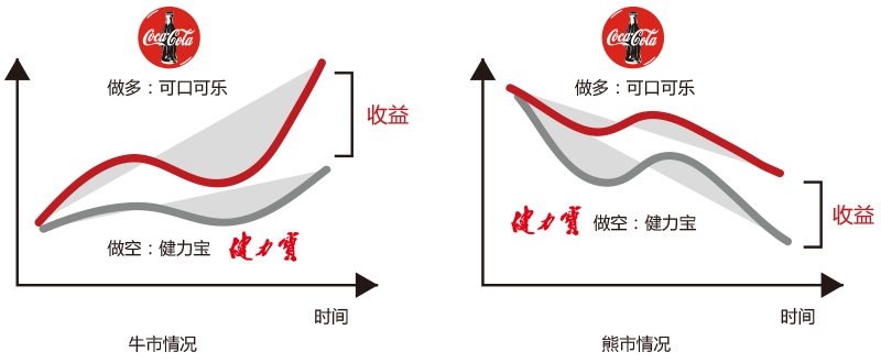 同属于食品饮料板块的可口可乐与健力宝,从历史业绩来看,可口可乐的业绩走势一直好于健力宝,多头买入业绩走势良好的股票可口可乐,融券卖出业绩走势普通的股票健力宝(市场头寸不为0);在牛市下,可口可乐的业绩由于好于健力宝,基金经理相信其股价涨幅会超过健力宝,虽然牛市下,健力宝股票上涨,导致融券卖空健力宝亏钱,但是可口可乐的涨幅带来的收益能超过这部分的亏损,最终差值即获得的绝对收益;熊市下,相同的操作方法,由于可口可乐的业绩好于健力宝,健力宝的股价跌幅大于可口可乐,融券卖出健力宝的收益超过做多可口可乐的亏损,二者的差值便是正的绝对收益。