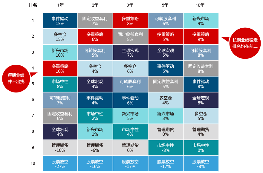多策略相对于其他单一策略更稳健,能平抑不同策略波动,适合稳健投资者。此外,多策略对冲基金短期业绩可能并不出挑,但长期业绩却稳定靠前,适合长期持有。
