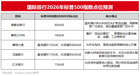AI资本开支周期继续加速的背景下,国际投行普遍预计2026年美股将延续慢牛,各投行预测2026年标普500目标点位在7500到8000之间,相对于该指数1月26日6950点的收盘点位或有8%-15%的空间。