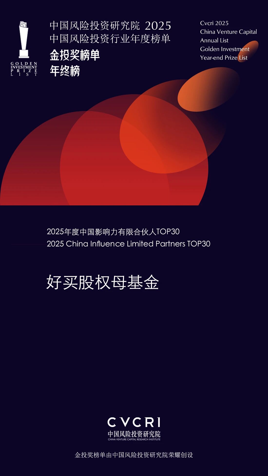 2026年1月29日,中国风险投资研究院正式发布《2025中国风险投资行业年度榜单·金投奖榜单·年终榜》,好买股权母基金凭借在战略布局、投资能力、市场影响力等多维度的卓越表现与均衡实力,荣获“2025年度中国影响力有限合伙人TOP30”。