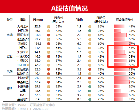 结合PE估值与PB估值,看A股主要宽基指数的综合估值分位,中证1000、中证500虽然偏高估,但尚未处于历史上的极端估值区间。所以当前并未到过于担忧系统性风险的时期。