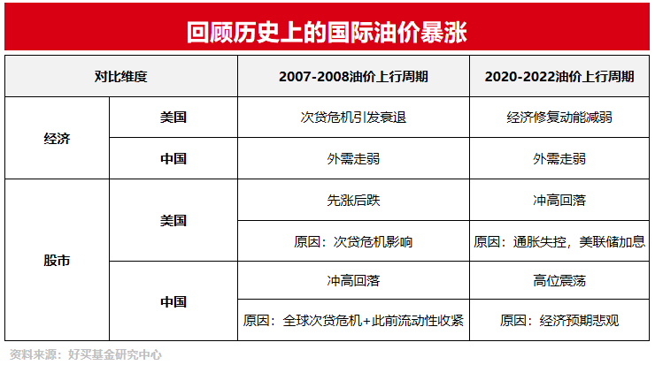 我们可以复盘下2007-2008年和2020-2022年两轮国际油价暴涨对国内外经济和股市的影响情况。