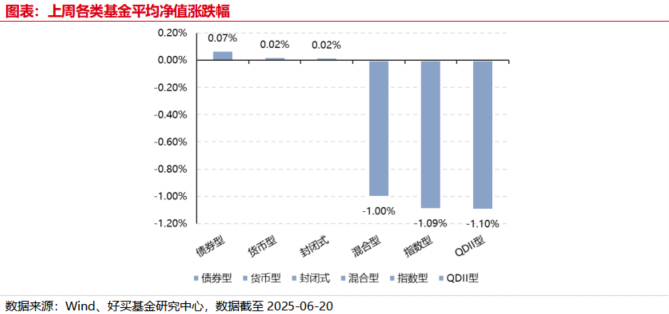 上周,国内权益基金普遍下跌,其中股票型基金平均下跌1.45%,混合型和指数型基金平均分别下跌1.00%和1.09%。QDII基金平均下跌1.10%。