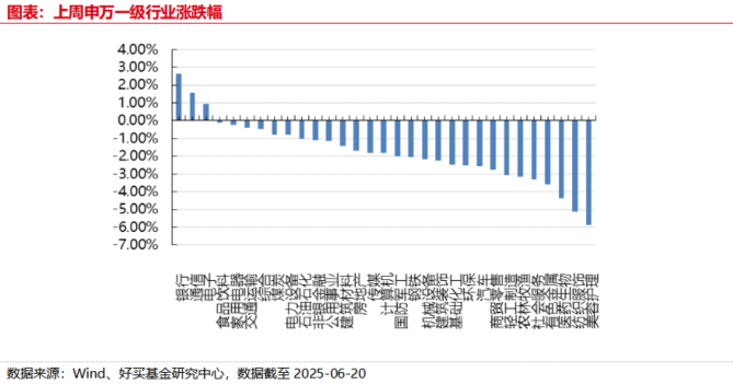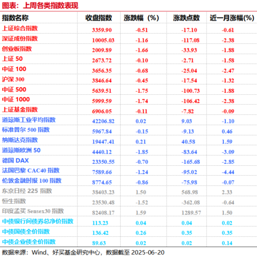 上周市场继续弱势震荡,结构上分化态势明显。宏观层面,国内5月经济数据略超预期,但有以旧换新透支和抢出口效应影响,同时陆家嘴论坛在新的政策上相对平淡;美联储6月议息会议按兵不动,美国经济前景的不确定性仍然处于较高水平;中东紧张态势升级,关注美方介入后续动作。结构上,前期表现强势的港股新消费和创新药板块,近期出现较明显调整,带动A股相关板块也出现较大波动;国内基本面延续内需偏弱+结构性景气的格局,顺周期板块多数调整,银行作为红利资产代表继续上涨;陆家嘴论坛上“科创”议题关注度再度提升,叠加TMT和先进制造景气度回升,带动相关资产近期重拾超额。
