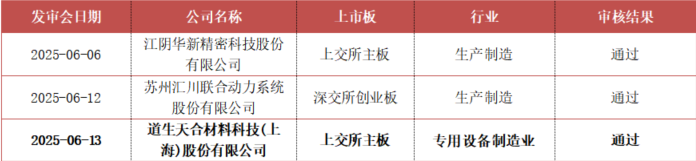 6月13日,道生天合材料科技(上海)股份有限公司主板IPO上会审议获通过。