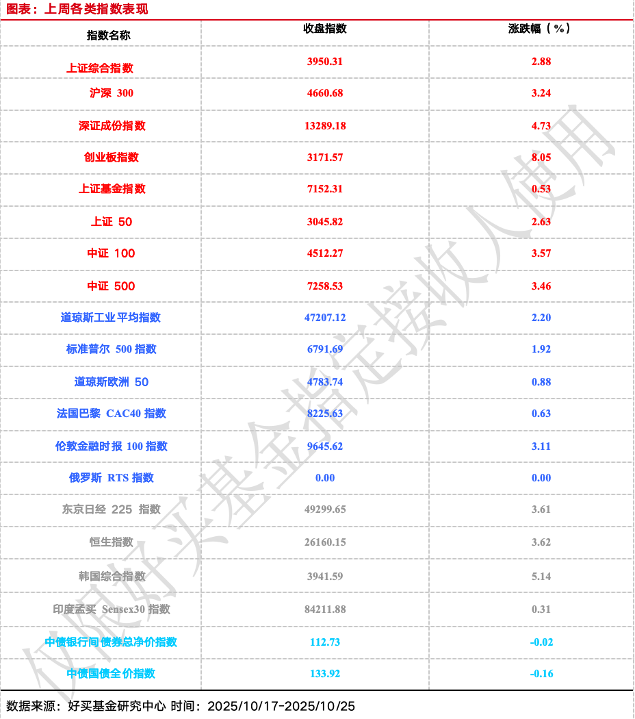 上周,欧美主要市场普遍上涨,其中,道指上涨2.20%,标普500上涨1.92%;道琼斯欧洲50 上涨0.88%。亚太主要市场普遍上涨,其中,恒生指数上涨3.62%,日经225指数上涨3.61%。