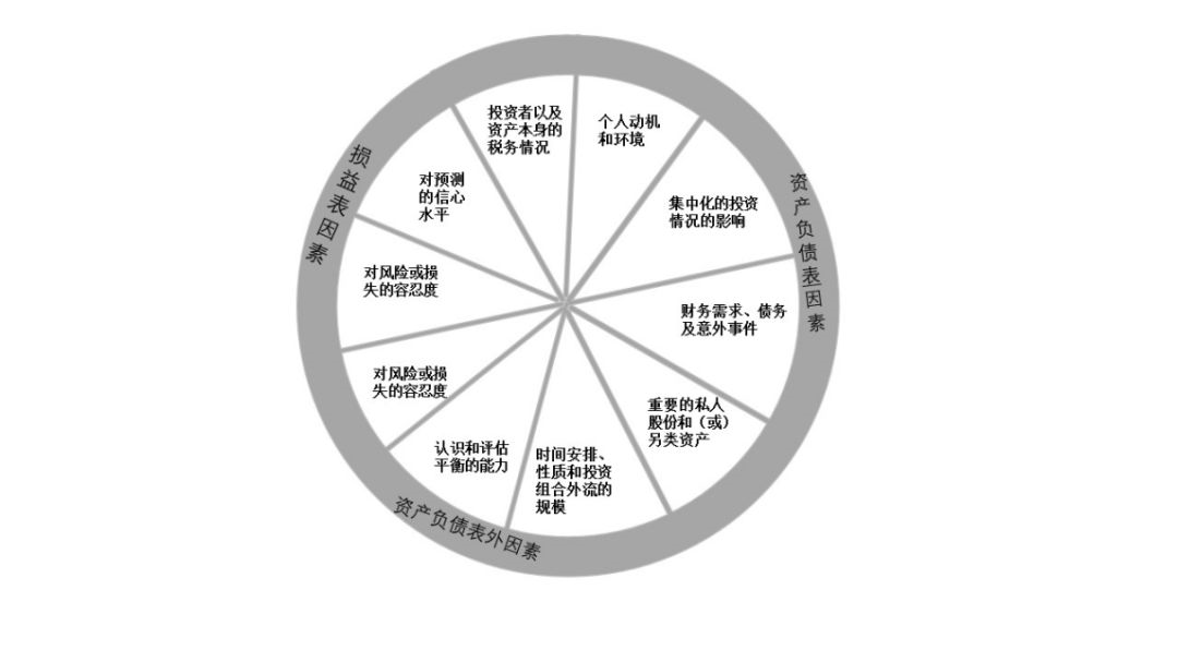 在形成资产配置组合的过程中,决定个人投资者资产配置行为的首要决定因素包括以下三大类: (1)损益表因素; (2) 资产负债表因素;(3) 表外因素。