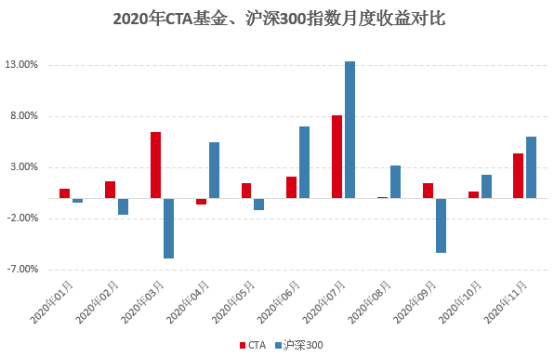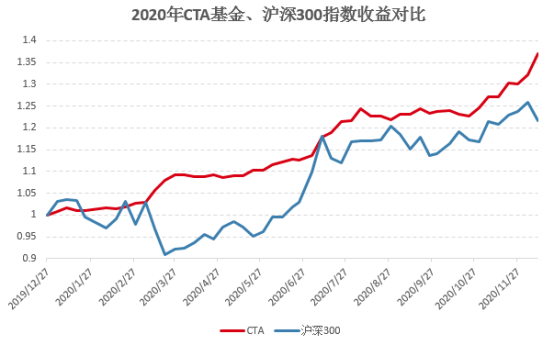 以好买跟踪的54只CTA基金为例(根据策略完整度、投研能力、公司综合实力筛选出的主流机构),截至2020年12月11日,CTA基金年内平均收益36.95%。与权益类资产相比,CTA策略在收益和波动两方面的表现均优于沪深300指数。