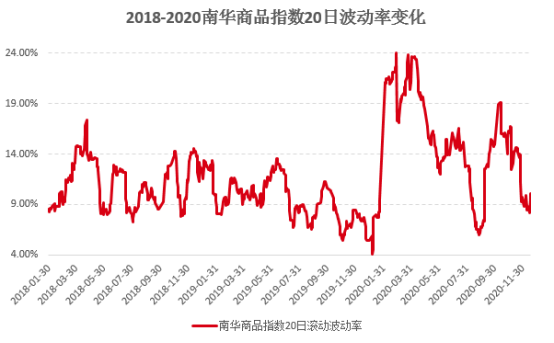 上图展示了2018年以来南华商品指数20日滚动波动率,可以看出2020年商品价格波动加剧。