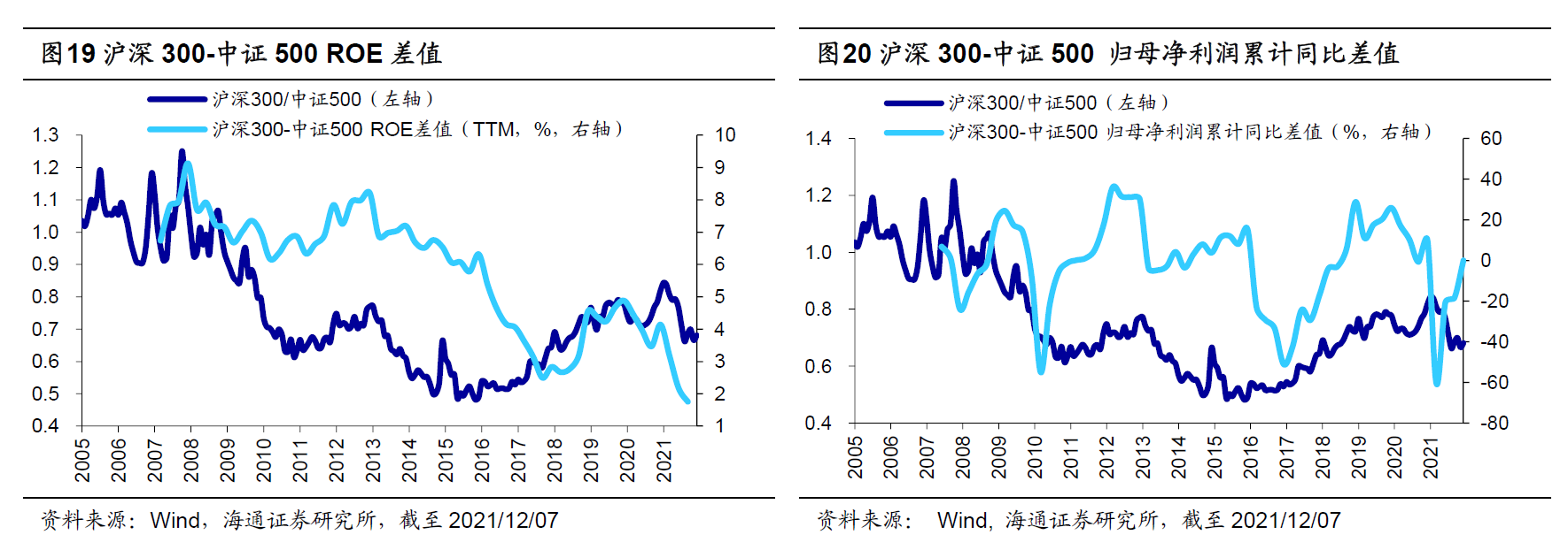 2022年沪深300有望略优于中证500。除了大小盘和成长价值外,市场上也常见用沪深300和中证500的对比来刻画市场风格。回顾历史,沪深300和中证500的相对走势轮动与大小市值风格接近,05-08年沪深300整体优于中证500,09年-15年中期间中证500相对沪深300表现优异,而15年中往后的时间内沪深300整体跑赢中证500,今年两者的相对趋势又开始略向中证500回归。与市值和成长价值风格类似,沪深300和中证500之间的轮动背后核心驱动力同样是盈利相对趋势,今年沪深300相对中证500走弱便源自于沪深300的盈利相对优势在减小,沪深300-中证500的ROE(TTM)差值从20Q4的4%降至21Q3的2%,同期归母净利润累计同比差值也从10%降至21Q3的-18%。展望2022年,我们预计全年沪深300归母净利润同比为7%,中证500为2%,业绩相对占优的情况下明年沪深300有望略优于中证500。