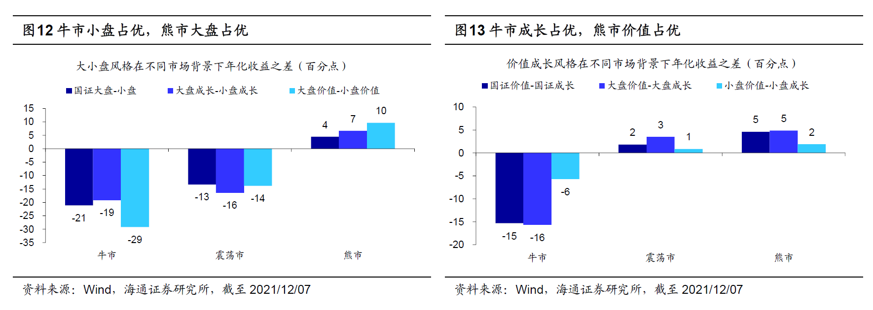 熊市阶段:价值与大盘占优。我们将2007/10-08/10、10/11-12/12、15/06-16/01、18/01-18/12这四个时间段均划分为熊市,在这四次熊市中,国证价值指数的区间年化收益率分别跑赢国证成长指数3、4、3、9个百分点,国证大盘指数分别跑赢小盘指数-5、7、12、5个百分点。