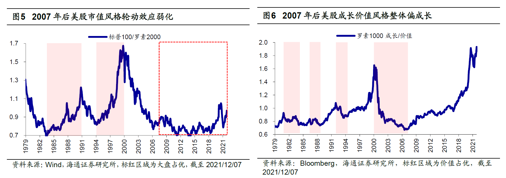 美股:2007年以来美股大小市值风格弱化,成长风格一枝独秀。我们先以时间序列更长的美股为例,用标普100相对罗素2000的走势来刻画1979年以来美股的市值风格轮动,可以发现在2007年以来美股的市值风格轮动明显弱化:1983-2007年期间美股经历了两轮完整的大小盘风格轮动周期,且在大盘风格占优的区间内标普100相对罗素2000的比值均翻了一倍,而2007年至今(截至2021/12/07,下同)美股市值风格整体略偏大盘,但标普100相对罗素2000的比值基本在0.7-1.1内波动,相较过去美股市值风格的影响明显减弱。