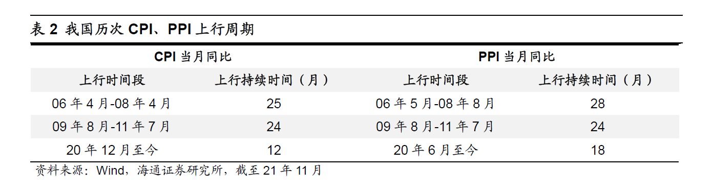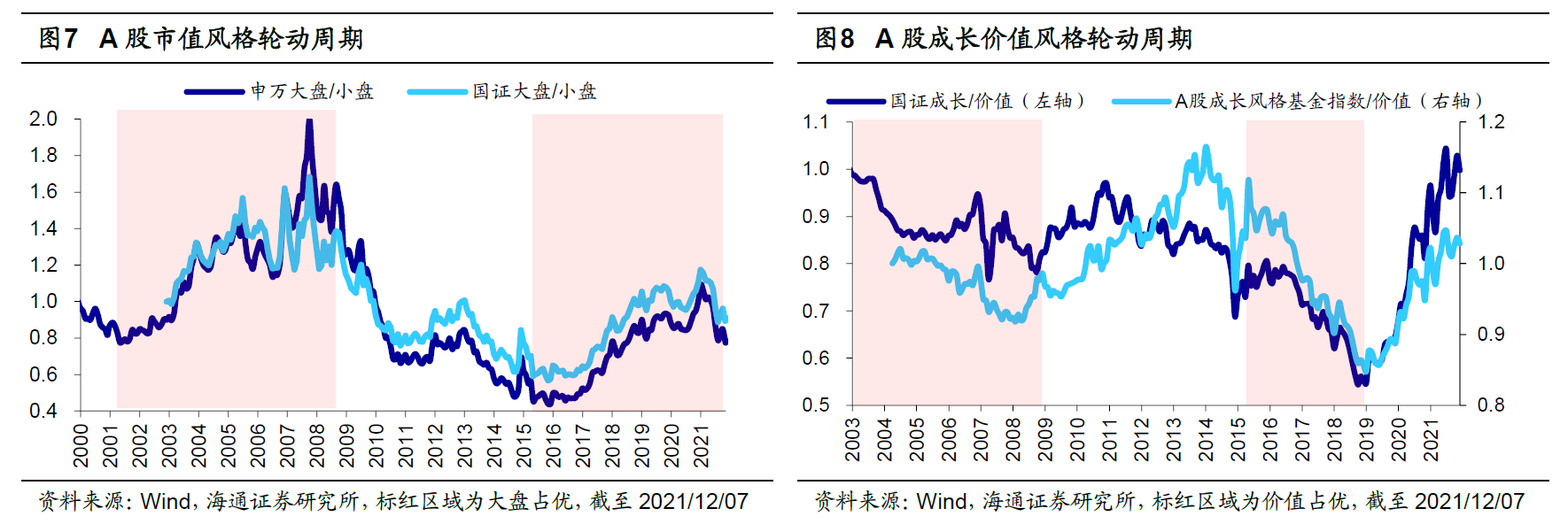 2022年大盘和价值或略优。展望2022年,从整体市场环境来看,我们认为A股在经历19-21年三年上涨后或将迎来阶段性的修整,背后是通胀高位和盈利周期性回落的双重扰动:通胀方面,回顾2000年以来的典型通胀周期,CPI上行周期大约持续2年,PPI上行持续2-2.5年,当前这轮通胀周期中,CPI低点是20年11月-0.5%,PPI低点是20年5月-3.7%,截至21年11月仅分别上行12个月、18个月,从时间维度看,通胀上行周期还未走完。明年随着美欧等发达经济体的复苏趋势进一步确认,国际定价的大宗商品仍存在进一步上涨的驱动力。同时商品的涨价将推升全球通胀预期,美联储加息预期升温,美债利率的中枢上移。美债利率上移叠加通胀的压力,我国国债利率或将难以下行,进而制约A股估值抬升;盈利方面,2002年以来五轮A股的ROE上升周期平均持续6-7个季度,本轮ROE于20Q2见底,20Q3开始回升,预计将于22Q1见顶。明年二季度后A股ROE大概率开始步入下行周期,这是因为如前所述明年我国通胀压力或将进一步发酵,历史经验显示通胀后期A股ROE将逐步恶化,详见《通胀前期盈利上、股市涨-20210516》。