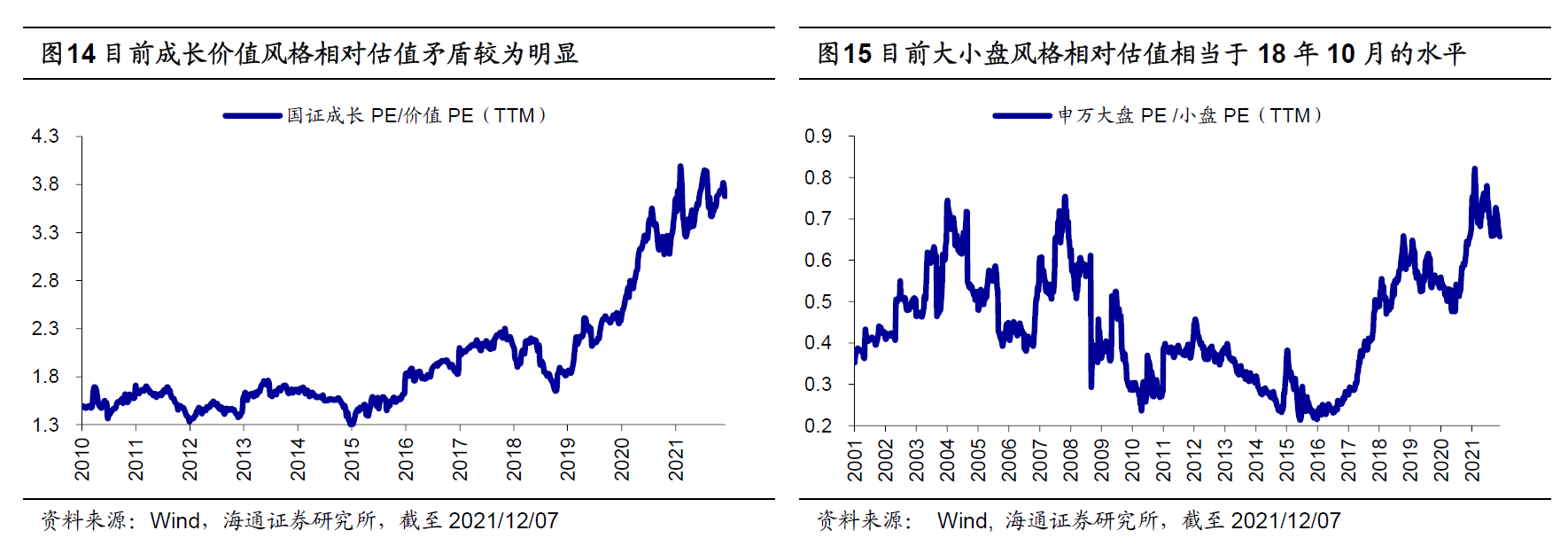 相对估值角度,目前成长价值风格分化较为明显,大小盘风格相对估值尚可。目前风格的轮动进行到何种程度了?我们从风格指数市盈率(TTM,下同)对比的角度进行分析:成长价值风格方面,在经历了三年的成长风格占优后,目前(截至2021/12/07,下同)成长价值风格的估值矛盾已经较为明显,国证成长PE相对国证价值PE的比值已达3.7,接近2010年以来的历史极值;市值风格方面,在今年市值风格略回归均衡后申万大盘PE相对申万小盘PE的比值已从今年2月的高点0.8降至目前的0.66,相当于18年10月的水平。值得注意的是,虽然目前大小盘的相对估值看似仍处于历史高位,但近年来注册制的推进已经使得大盘股相对小盘股的估值溢价趋势性上升:过去注册制实施之前企业上市成本较大,因此一些经营不善的小市值上市公司仍具有可观的“壳价值”,而注册制改革使得“壳价值”被极大压缩,公司股价与基本面的联系进一步加强,因此小盘股整体的估值溢价下降是趋势性的。