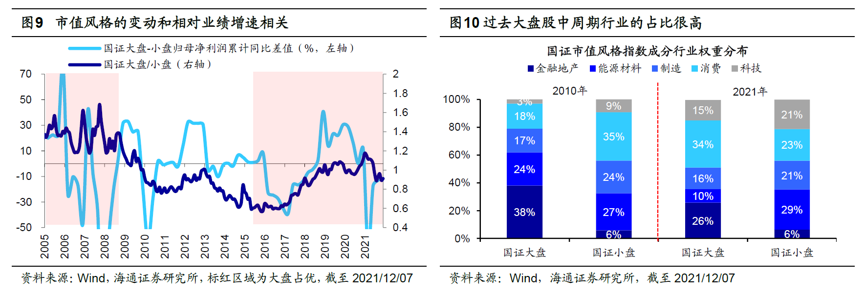 产业结构转型升级背景下大盘股的主要行业从周期转为消费科技,大小盘间盈利差距的波动在缩小。可以发现近年来A股大盘风格持续占优的背后是盈利存在长时间的相对优势,这实际与我国的产业结构转型息息相关。在过去我国经济中周期行业的占比很高,因此大盘股的行业分布中周期占了很大比重,2010年时金融地产和能源材料在国证大盘指数中的权重为62%,在小盘股中仅占33%,由于这些周期行业的业绩波动相较消费和科技往往会更大,因此大小盘盈利的相对趋势容易反转,进而使得大小市值风格产生轮动。而随着我国产业结构持续转型升级,大盘股中消费和科技的占比开始提升,目前(截至2021/12/07)国证大盘指数中消费和科技的占比已从2010年的21%提升至49%,金融地产和能源材料的占比则从62%降至33%。可见在产业结构转型升级背景下,大盘指数行业结构的变化缩小了大小盘间盈利差距的波动,进而使得A股市值风格的轮动效应明显减弱。