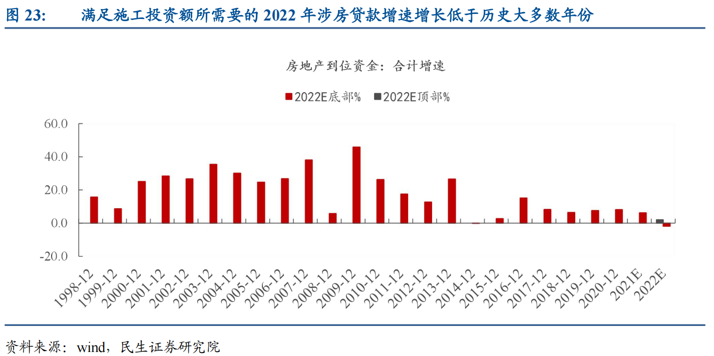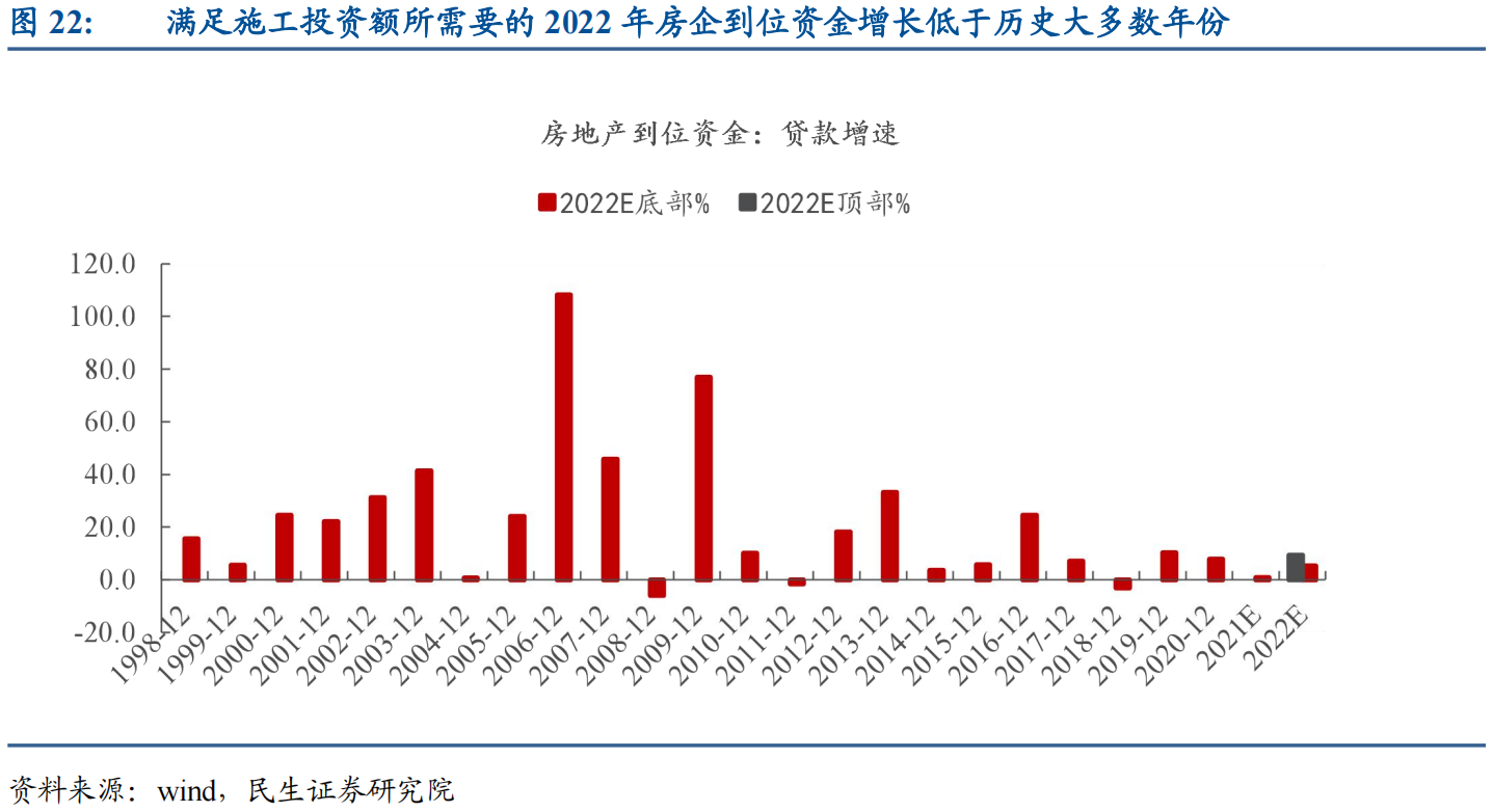 而对房地产的需求维持稳定,其实不需要过强的假设。施工面积和投资者维持稳定,必要的一个假设是房企的资金能够支持上述投入,基于2003年以来的月度数据,我们以施工投资额(建安+器具购置)对房企到位资金合计值做回归,发现解释力度达到0.98,系数显著(P<0.05),因此我们可以用前文测算的施工投资额区间对房企到位资金做简单拟合。根据我们测算,房企到位资金增长-1.8%到2%即可满足施工投资额,基于2006年以来的月度数据,我们以施工投资额(建安+器具购置)对房企到位资金合计值做回归,发现解释力度达到0.98,系数显著(P<0.05),因此我们可以用前文测算的施工投资额区间对房企到位资金做简单拟合。房企到位资金分为:国内贷款、自筹资金、其他资金(定金及预付款、个人按揭贷款)、其他应付款,分别可以简单理解为:房企在开发阶段获得的开发贷、委托贷款等;房企以自身资本金或集团债券融资获得的自筹资金;销售回款;对上游供应商的经营占款。其中国内贷款、个人按揭贷款这两项涉房贷款占资金来源的比例在30%上下波动,而根据测算,2022年所需的涉房贷款增速在5.2%-9.3%之间,低于历史上大多数年份,且低于2022年人民币贷款整体的增速一致预期(11.4%)。