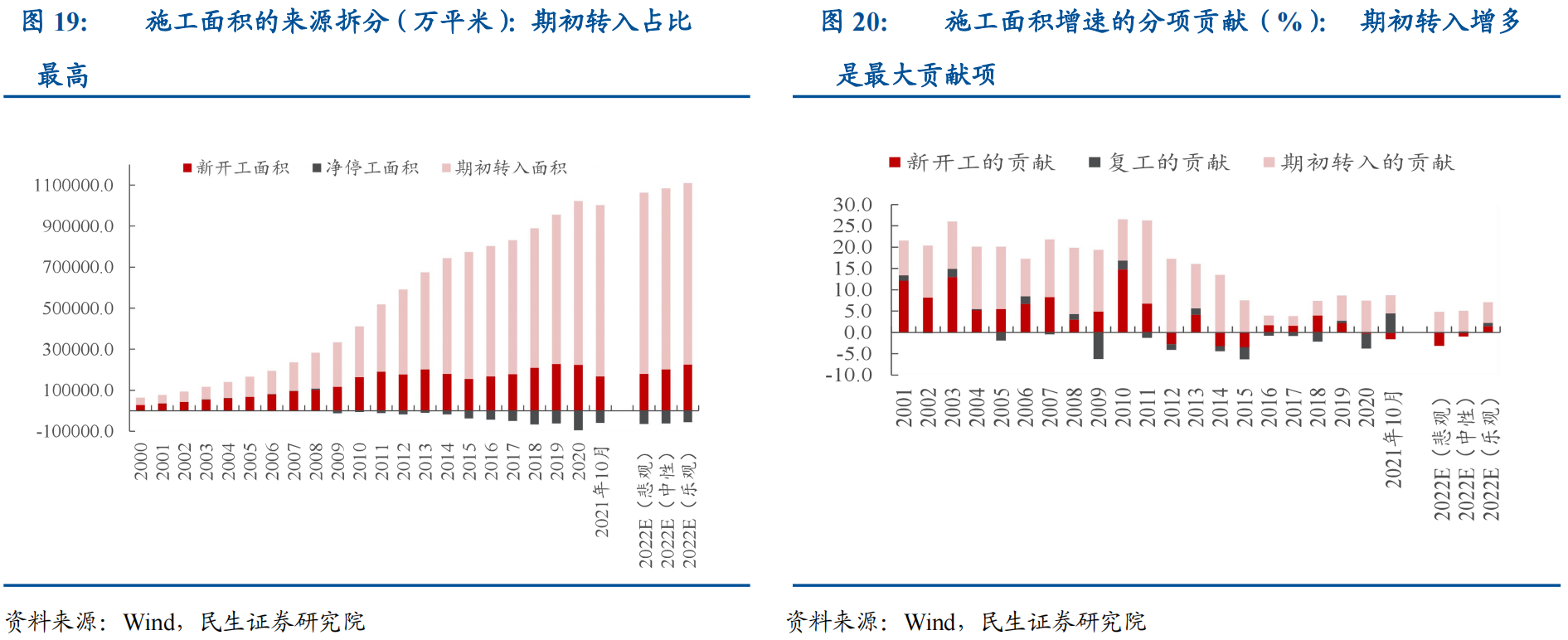 正因为房地产对经济的影响重大,对其“下行”幅度需要更加审慎地下结论。上文中提到的建筑安装、设备器具的投资额取决于施工面积大小和单位施工成本的高低,因此,探究房地产对经济的“拖累”,需要关心的是“施工面积”这一滞后指标,而非拿地、销售等领先指标。房地产的是一项特殊的“产品”,完整经历拿地、新开工、取证销售、施工、竣工环节大致需要2.5-3年的时间,这意味着当期看到拿地差、销售差,其实反映的是下一期新开工动力不足,但不等于施工面积必然衰退。而每一年的施工面积增长来源于三个贡献项:1、新开工面积的增长 2、停缓建面积的减少(复工)3、期初转入的增多(上期施工-上期竣工)-(上上期施工-上上期竣工),换言之,上期施工面积多对本期施工面积是正向的、上期竣工少对本期施工面积是正向的。在我们的测算下,由于2021年相对2020年的施工面积大增和近几年竣工的不足,2022年的施工面积、施工相关的投资额(即上文中提到对经济总量产生影响的建安工程、设备器具购置)将维持稳定,不会对经济造成过大的拖累。