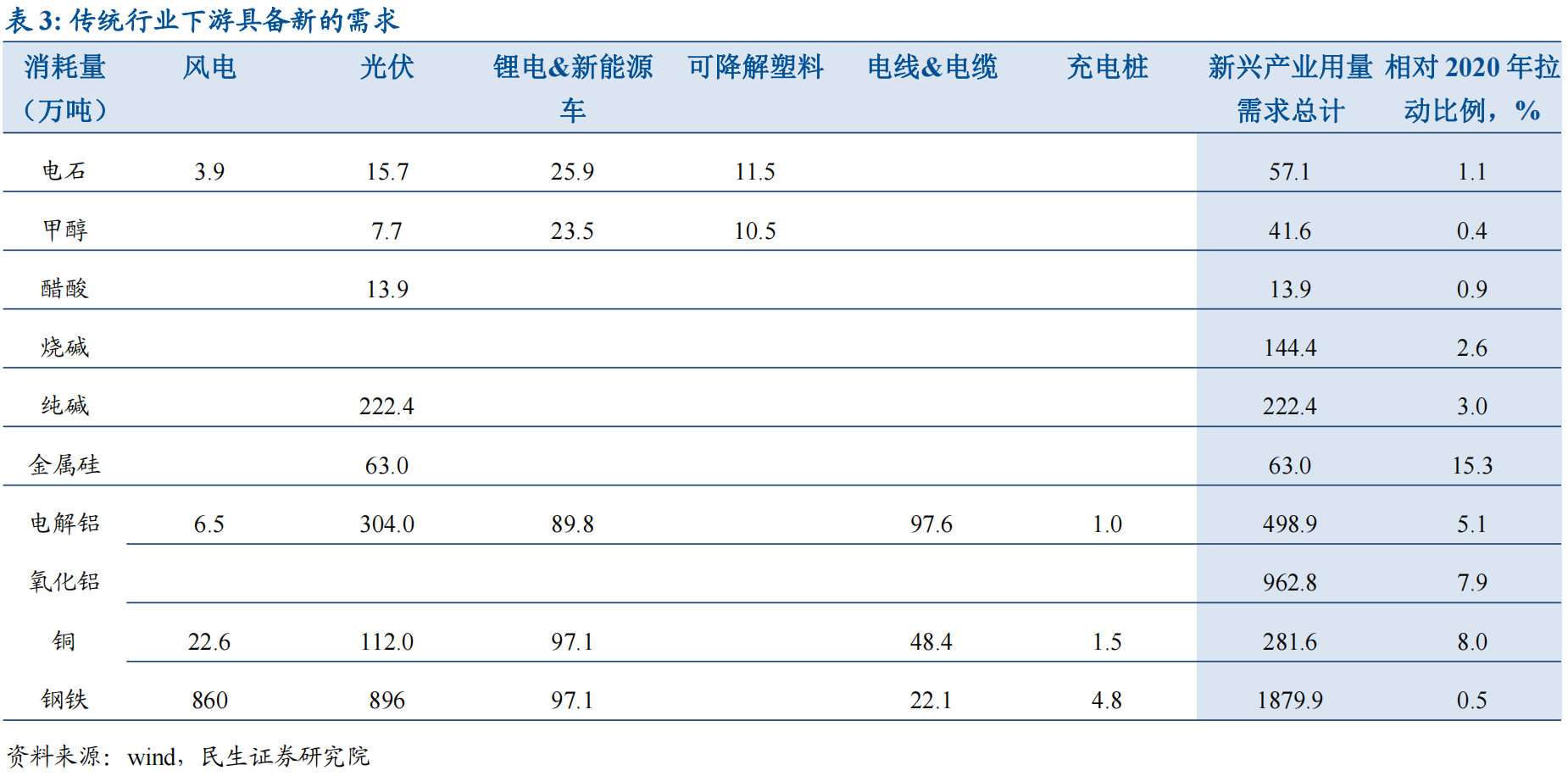 在房地产拉动的传统需求稳定的基础上,新的信用扩张渠道也将对传统行业形成新增需求。在新能源下游市场(车、风电、光伏等)不断扩容放量的过程中,也将带来对于传统工业金属/化学原材料的需求:工业金属主要包括铜、铝,甚至是钢铁;非金属原材料如硅;化学原材料包括电石、甲醇、醋酸、烧碱、纯碱、六氟磷酸锂等。