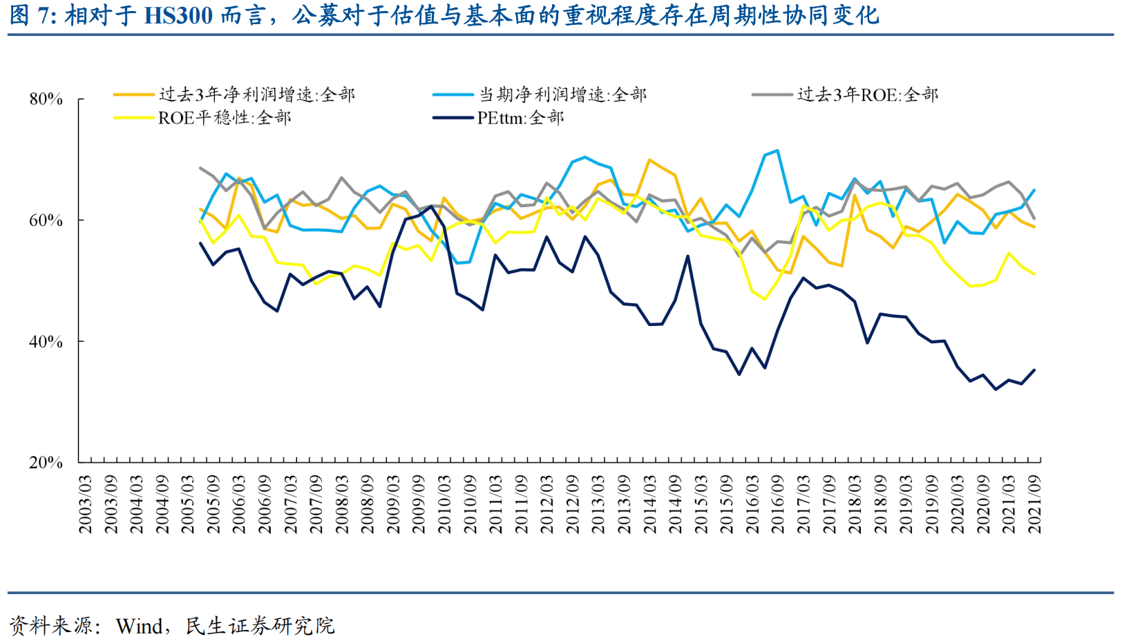 如果我们以HS300指数成分股为基准,计算主动偏股基金持有市值前100大的重仓股的过去三年净利润增速、当期净利润增速、过去三年平均ROE、ROE平稳性、估值(PEttm)在某一时点的分位数(注:ROE平稳性、估值等指标采用逆向排序,即分位数越高越稳定、便宜,其他指标为正向排序)发现:2021年以来,主动偏股基金持有市值前100大的重仓股组合的“当期净利润增速”的分位数在稳步上升,并于2021Q3成为分位数最高的指标,而估值(PEttm)的分位数则从历史地点逐步回升,这意味着:2021年以来,“当期净利润增速”逐步成为当前主流机构投资者最看重的因素,而主流机构投资者对估值的容忍度在逐步下降。相对于HS300而言,公募对于估值与基本面的重视程度存在周期性协同变化:对估值的容忍度从上升到下降过程的同时会经历“重视当期景气-重视过去3年景气-重视当期景气”三个阶段。