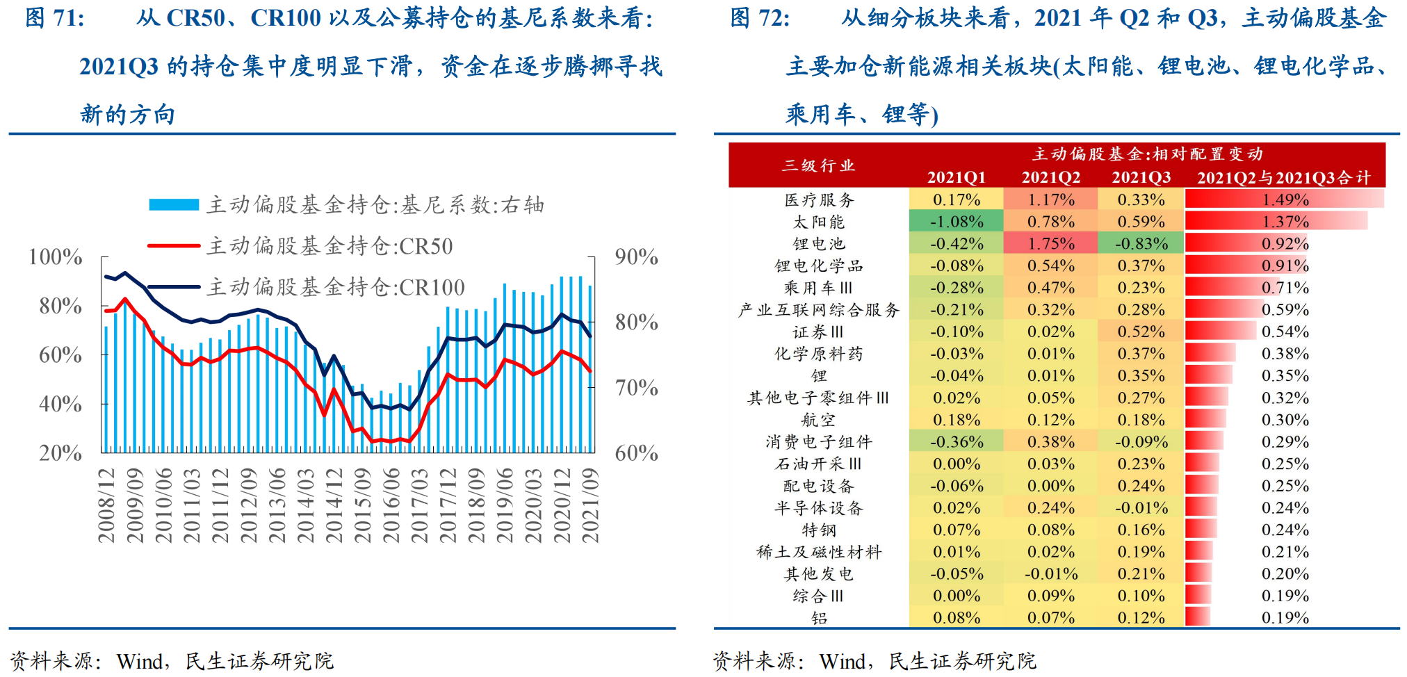 在这样一个增量资金偏弱的市场下,我们看到:2021年以来主动偏股基金持仓集中度下降,并逐步向新能源相关板块腾挪,主流公募基金资产正逐步集中于新能源相关行业以抵抗过去的经济下行。