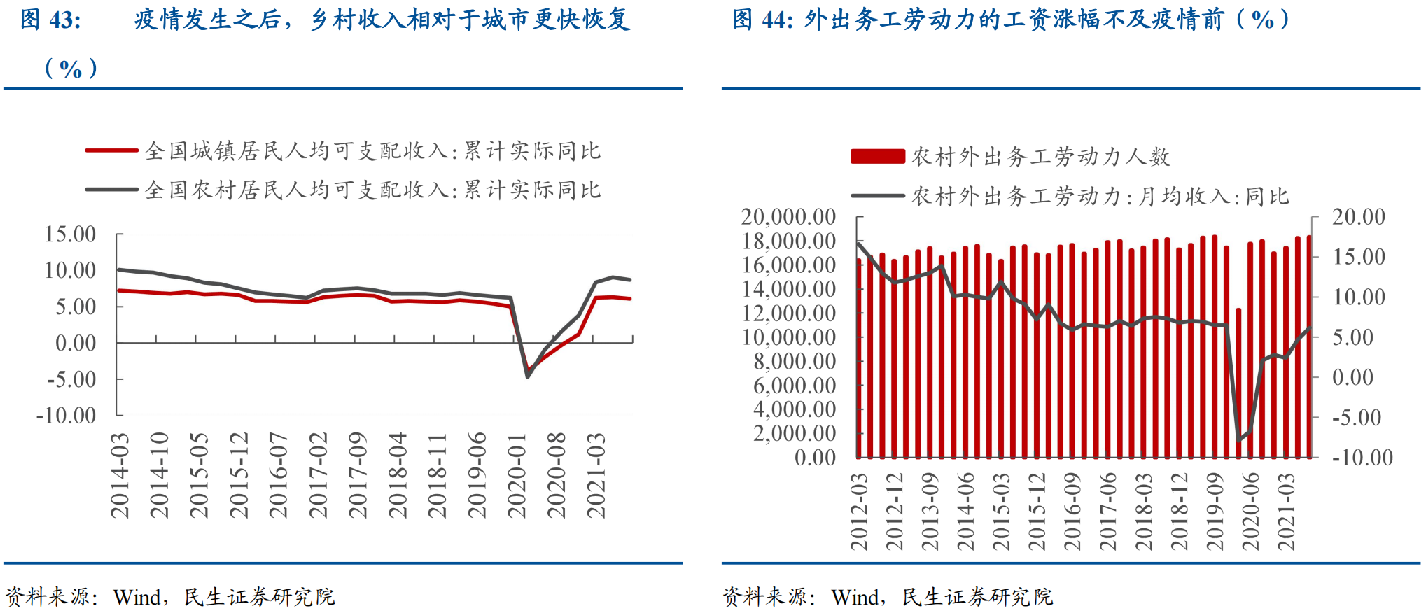 稳增长的抓手可能在于乡村,原因在于乡村“有人”、“有空间”,振兴乡村“有工具”、“有好处”。疫情以后,不但乡村收入相对于城市更快恢复,而且人口回流家乡的趋势更加明显,目前农村外出务工劳动力绝对值恢复接近疫情前,但工资相对于疫情前上涨幅度年化6.1%,仍与疫情前的增长速度形成差距,这也侧面反映了城市对农村剩余劳动力的需求在减弱,这又会进一步加剧“农民进城”这一现象的衰弱,人口从农村走向城市的趋势在发生改变。另外,农村土地流转正在为信用派生提供更多工具,农村集体经营建设用地入市流转已试点3年,2021年9月中央部署起草政策性文件,未来将成为乡村振兴资金的重要来源和信用派生的增量点。更不容忽视的是,巩固农村人口脱贫和提升农村居民收入同样也是缩小收入差距,实现“共同富裕”目标的重要抓手。2021年12月8日至12月10日召开的中央经济工作会议将乡村振兴和共同富裕提到了更高的地位,会议指出“全面推进乡村振兴,提升新型城镇化建设质量……把提高农业综合生产能力放在更加突出的位置,持续推进高标准农田建设,深入实施种业振兴行动,提高农机装备水平,保障种粮农民合理收益”,我们认为这将引领农业机械、种业等决定农业综合生产能力的行业更快发展。近日,国务院也印发了《“十四五”推进农业农村现代化规划》,要求“明确聚焦七个方面重点任务,即提升粮食等重要农产品供给保障水平,提升农业质量效益和竞争力,提升产业链供应链现代化水平,建设宜居宜业乡村,建设绿色美丽乡村,建设文明和谐乡村,巩固拓展脱贫攻坚成果、有效衔接全面推进乡村振兴”,这与共同富裕的要求不谋而合,在收入提升的同时,切实提高居民生活质量,有助于提振农村消费,也对改善农村居住环境提出了更高的要求。
