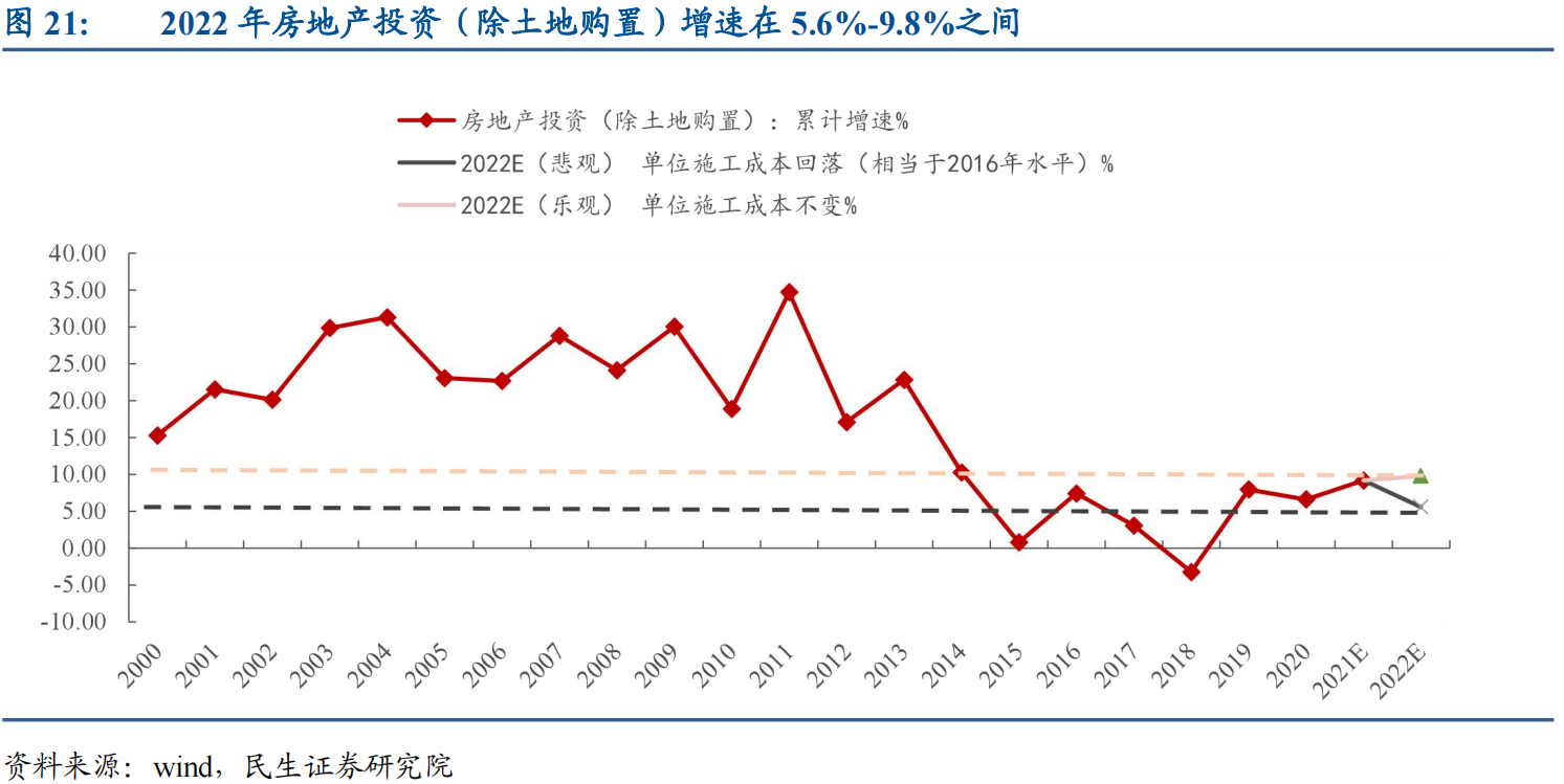 对单位施工面积所需成本做出不同假设下,我们计算出2022年房地产投资(除土地购置)增速在5.6%-9.8%之间,好于2015年、2017年和2018年。施工面积*单位面积施工成本=建安+器具投资额;单位面积施工成本与钢铁价格有同步关系,根据此可大致拟合单位成本。2021年钢铁价格出现了一轮明显的上涨,以2021年平均的单位施工成本(1164元/年)为假设,则是较为乐观的估计情形;更谨慎的假设是由于施工面积增速回落,建材面临的需求同样回落,但供应端仍面临收缩的限制,与此情形类似的是2016年(1140元/年)。
