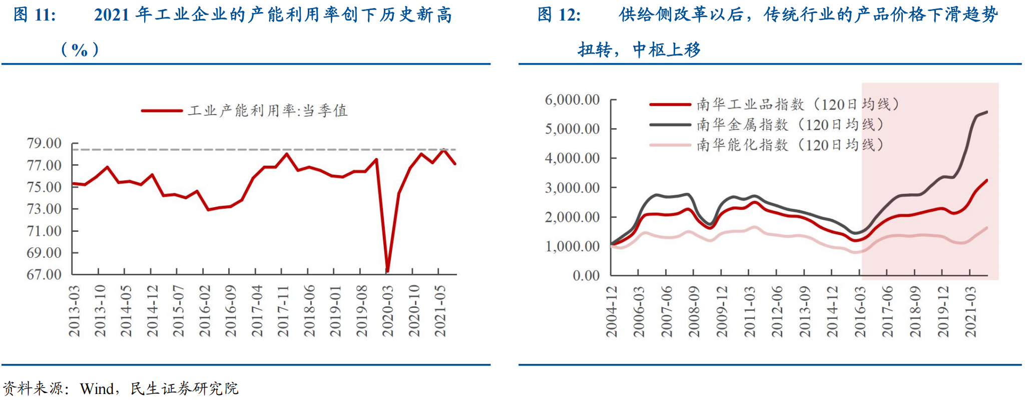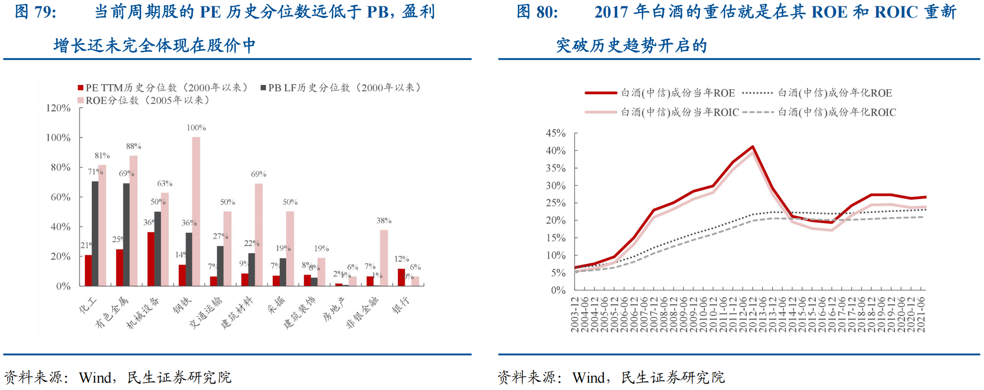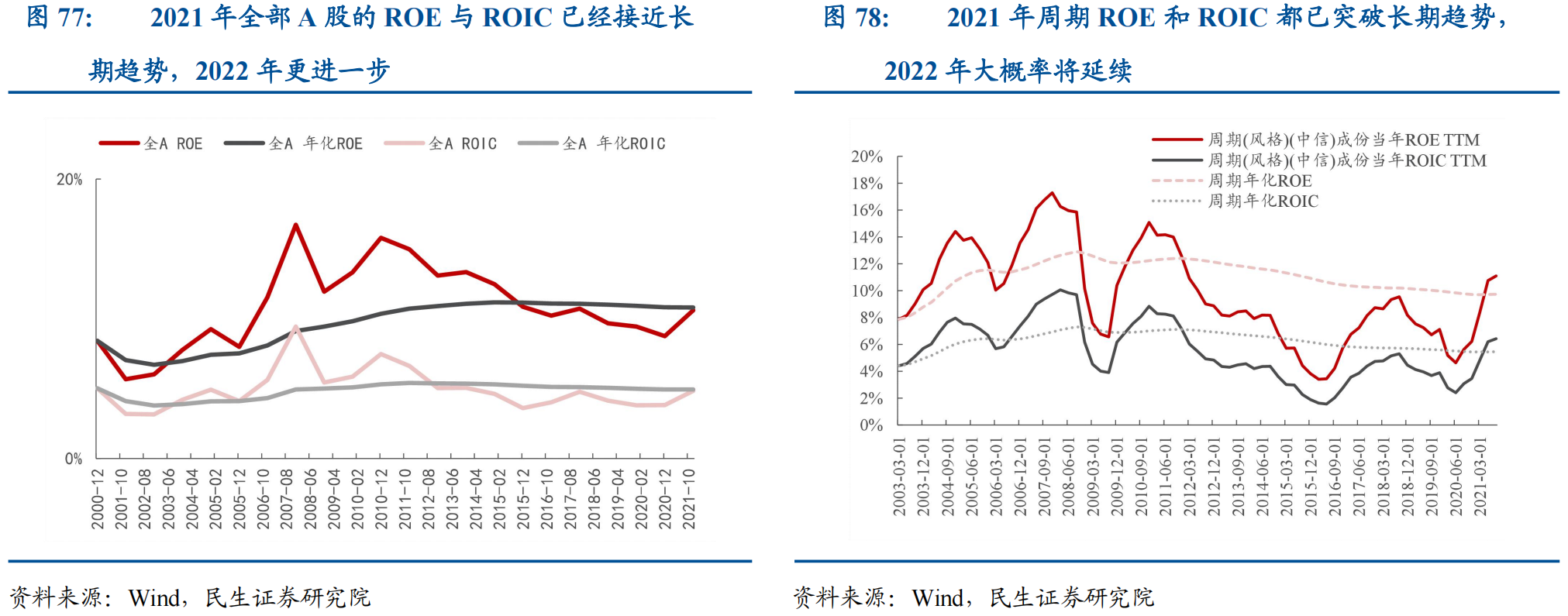 2021年全部A股的ROE与ROIC已经接近2000年以来的年化水平,而上一次接近是在2017年。值得关注的是2016年以来,大量ROE和ROIC实现第二增长曲线的企业实现了估值修复,2021年以来传统行业定价了其盈利增长并相继突破长期下行趋势,将会带来更多传统行业的重估。
