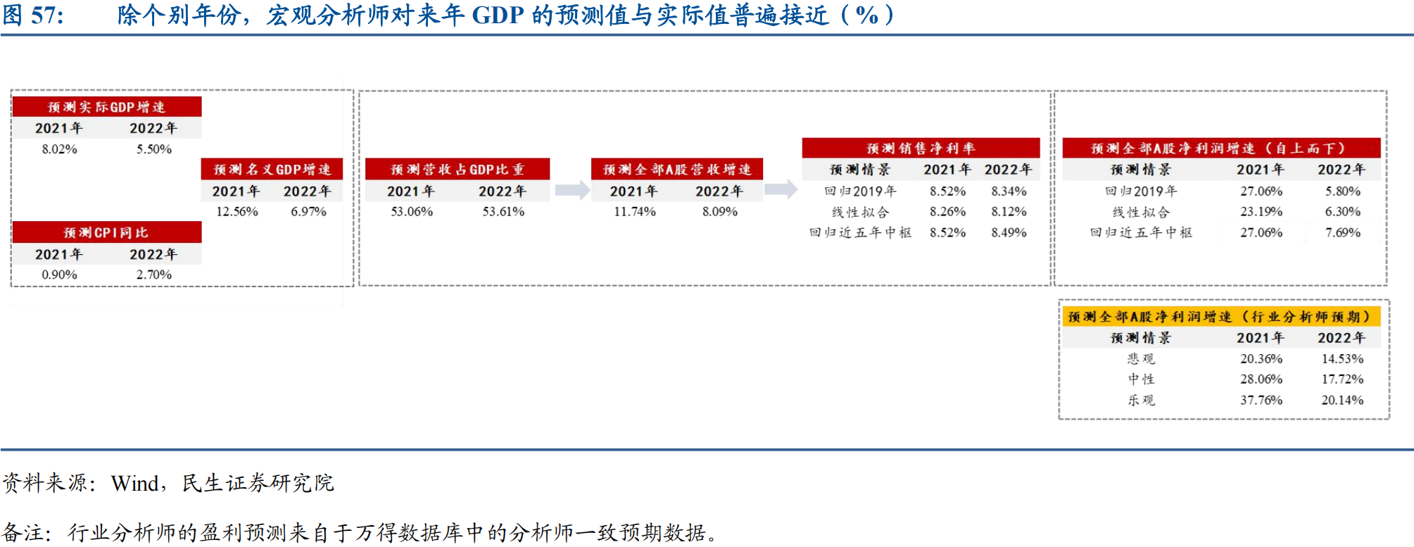 因此在本文中,我们采用自上而下的思路进行盈利预测。首先利用宏观分析师一致预期得到2021年与2022年的GDP预测增速,然后通过全部A股营收占GDP比重反算出2021年与2022年全部A股的营业收入,并通过预测的销售净利率得到全部A股的预测利润,最终测算可得,在销售净利率回归疫情前与回归过去五年历史中枢的假设下的2022年净利润增速分别为7.7%/5.8%,较行业分析师预测更为悲观(20.1%/17.7%/14.5%),行业分析师的盈利预测来自于wind的分析师一致预期数据。考虑到宏观分析师预测的准确性与稳定性均高于行业分析师,因此我们认为自上而下视角得到的审慎结果(均值6.7%)可能更接近于明年市场真实的盈利情况。