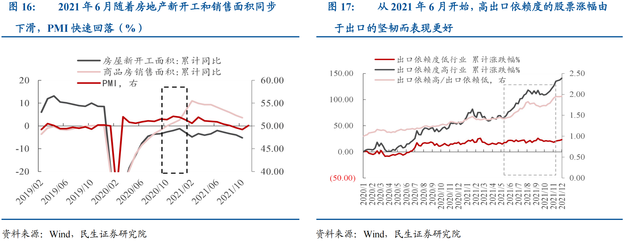 房地产景气在2021年下半年的快速走弱和部分房企出现的违约风险,造成了市场对2022年总需求回落的担忧,促使投资者选择基本面更坚韧的板块。这种担心不无道理,房地产对总需求的影响渠道是通过房地产投资中的建筑工程、安装工程、设备器具购置投资对其他行业形成需求,根据NBER的工作论文,以2017年的投入产出表计算,房地产及其相关行业占经济总量达到了28.7%。正因为房地产占经济总量的比例足够高,我们才会观察到自2021年6月房地产各项指标出现明显走弱时,宏观经济指标也同步出现了回落:从6月开始,房屋新开工面积累计增速及商品房销售面积累计增速双双回落,而PMI回落的斜率也开始变大。市场的表现与基本面的结构性吻合,从6月开始,在宏观经济中更为坚韧的出口链相关标的实现了超越市场其余板块的涨幅。