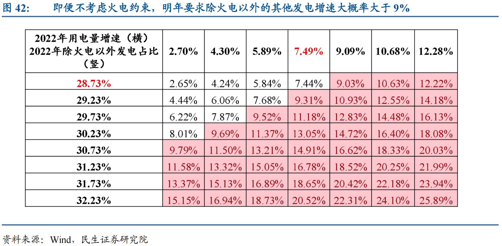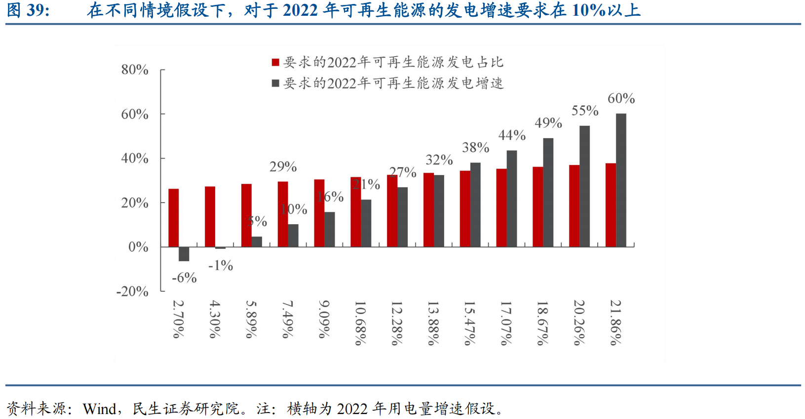 情形二:即便不考虑火电的约束(即对火电发电不作任何硬性要求),2022年要求的除火电以外其他形式的发电增速大概率大于9%。这里核心参数是用电量增速与除火电以外其他形式发电的发电量占比,2021年约为28.73%,而在火电发电占比不断下降的预期下,该占比大概率会不断提升。