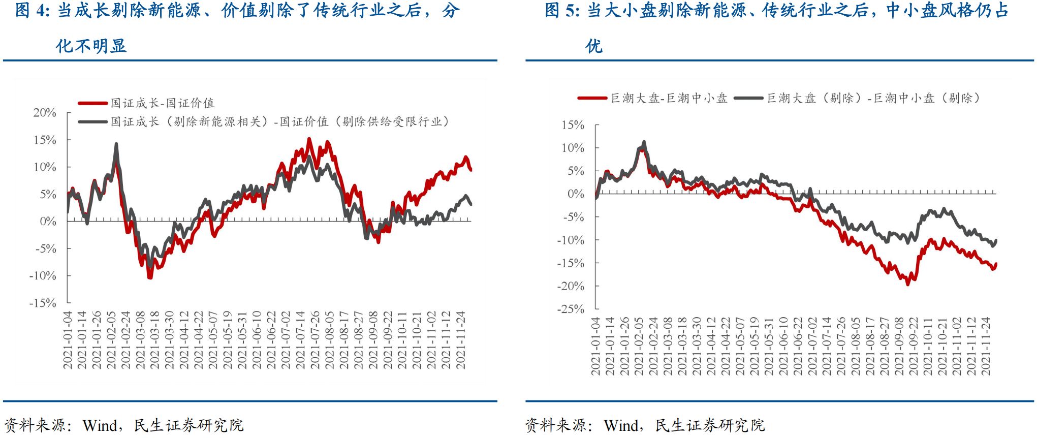 从市场风格上看,当成长剔除了新能源、价值剔除了供给受限的传统行业之后,成长/价值在2021年其实并未出现明显分化;而当大盘、中小盘剔除新能源、传统行业之后,大盘风格确实跑输了中小盘。