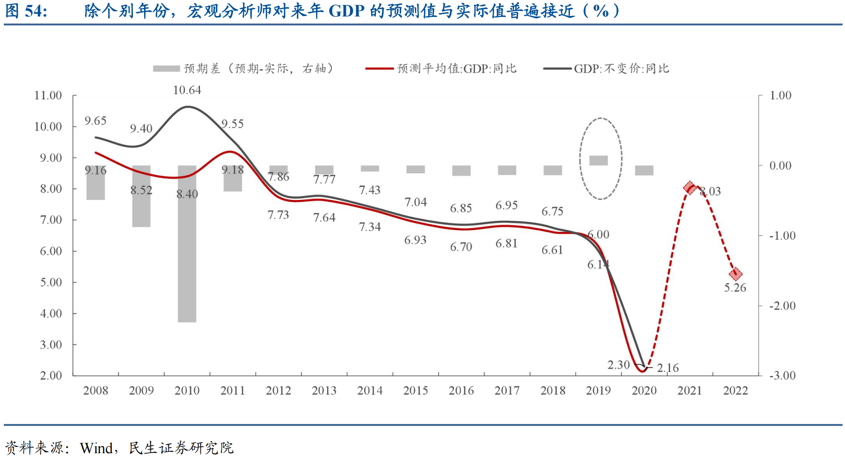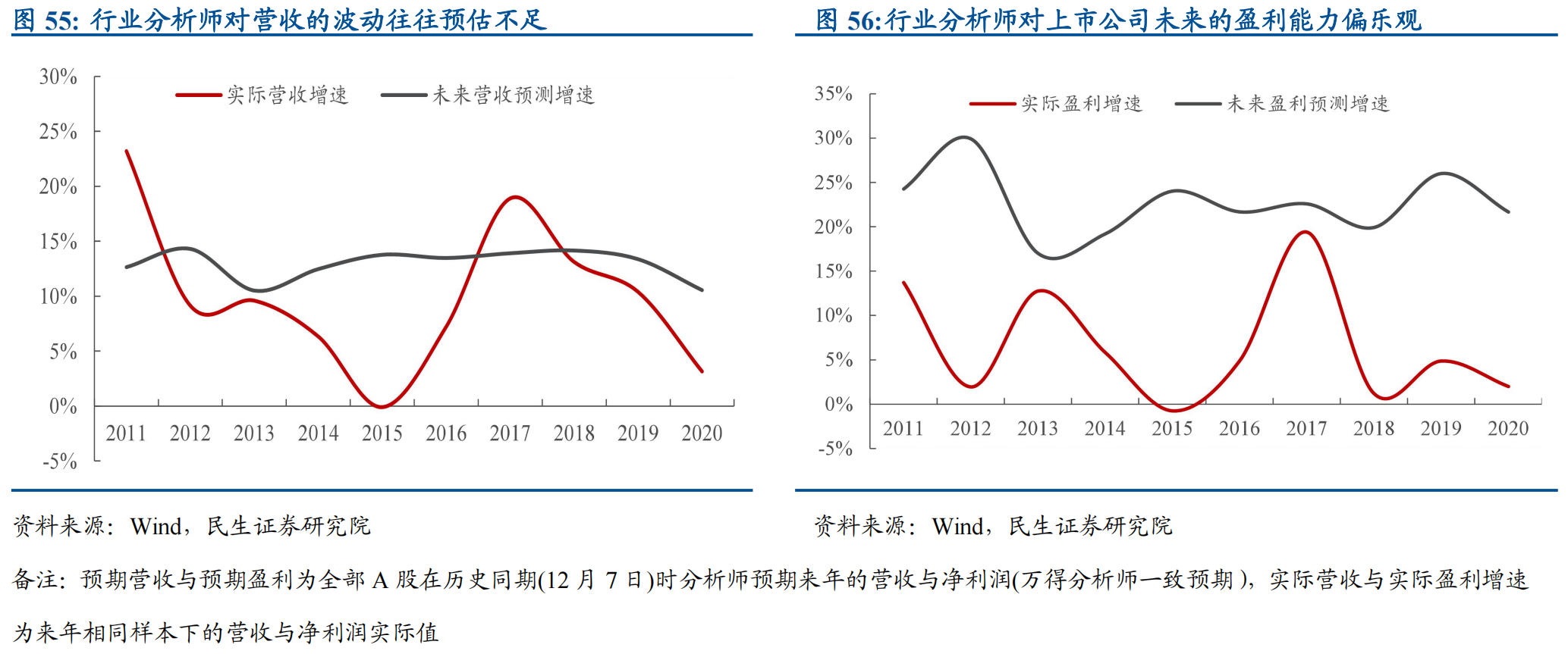 一般而言,盈利预测的方法往往分为自下而上与自上而下两种。从历史上看,宏观分析师对GDP的预测精度要优于行业分析师对于A股市场的营收与盈利预测。并且宏观分析师往往会略低估宏观经济在下行过程中的韧性,而行业分析师在多数情况下对A股的盈利预测相对乐观,对上市公司的盈利波动性估计不足。
