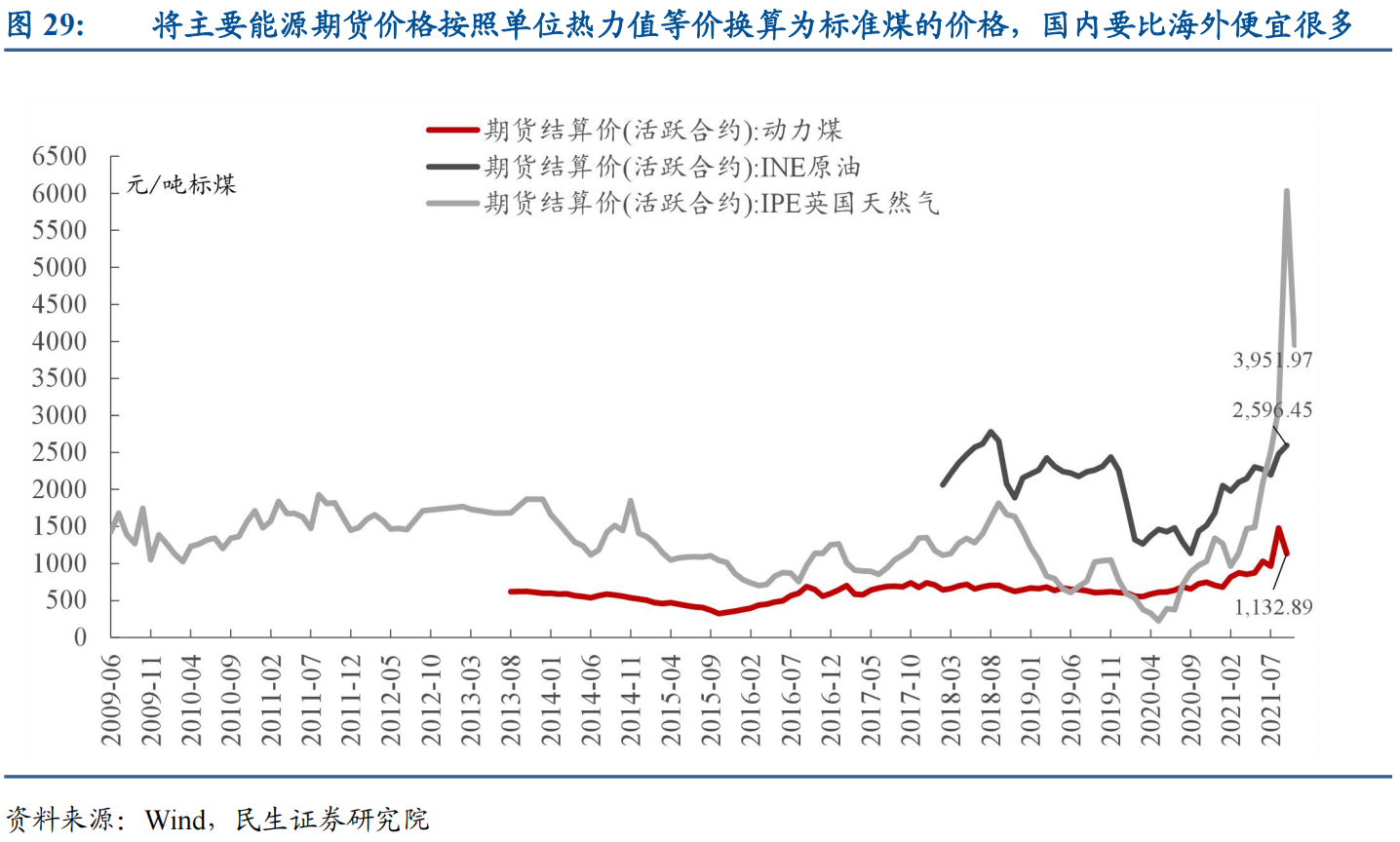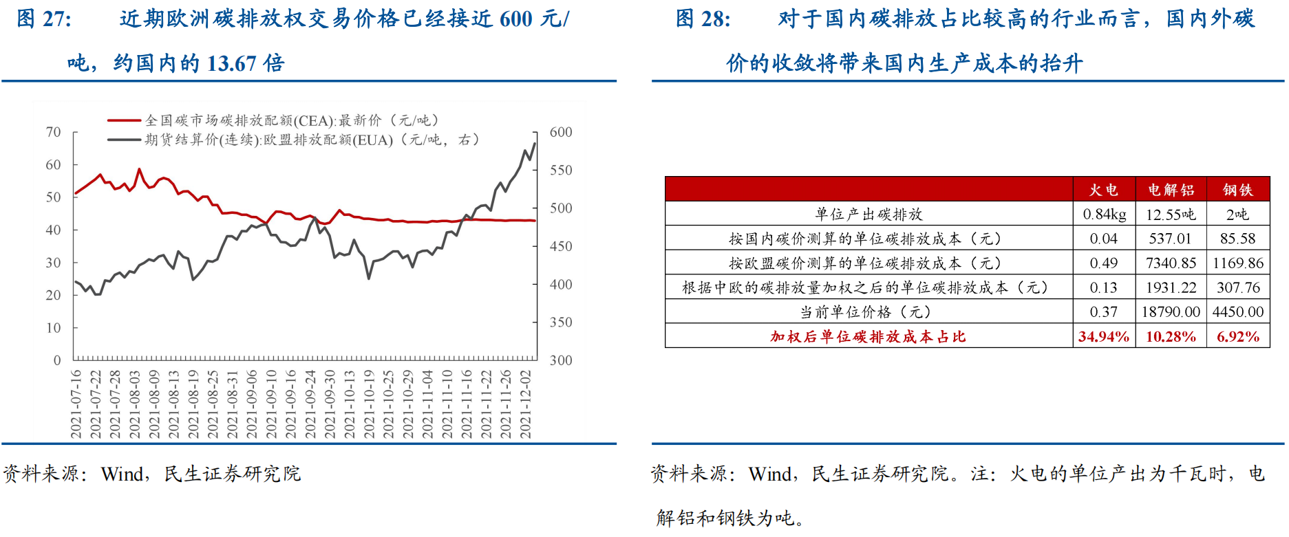 海内外碳价差距进一步拉大,或抬升部分高碳排放行业的生产成本;同时海外能源价格与国内差距也较大,上述两个因素都将给国内带来通胀压力。近期欧洲碳排放权交易价格已经达到国内的13.67倍,国内外碳价在供应链逐步修复的场景下将会有收敛的压力,因此对于国内碳排放占比较高的行业而言,典型的如火电/电解铝/钢铁,如果按照中国、欧盟2020年的碳排放量加权之后的碳价来测算它们的单位碳排放成本,则生产成本抬升很明显。与此同时我们如果将海内外能源按照标准煤的热力值进行等价换算,则我们发现国内能源的单位标准煤价格与海外定价的原油、天然气的价差较大,为中国进一步压低能源价格形成阻碍。