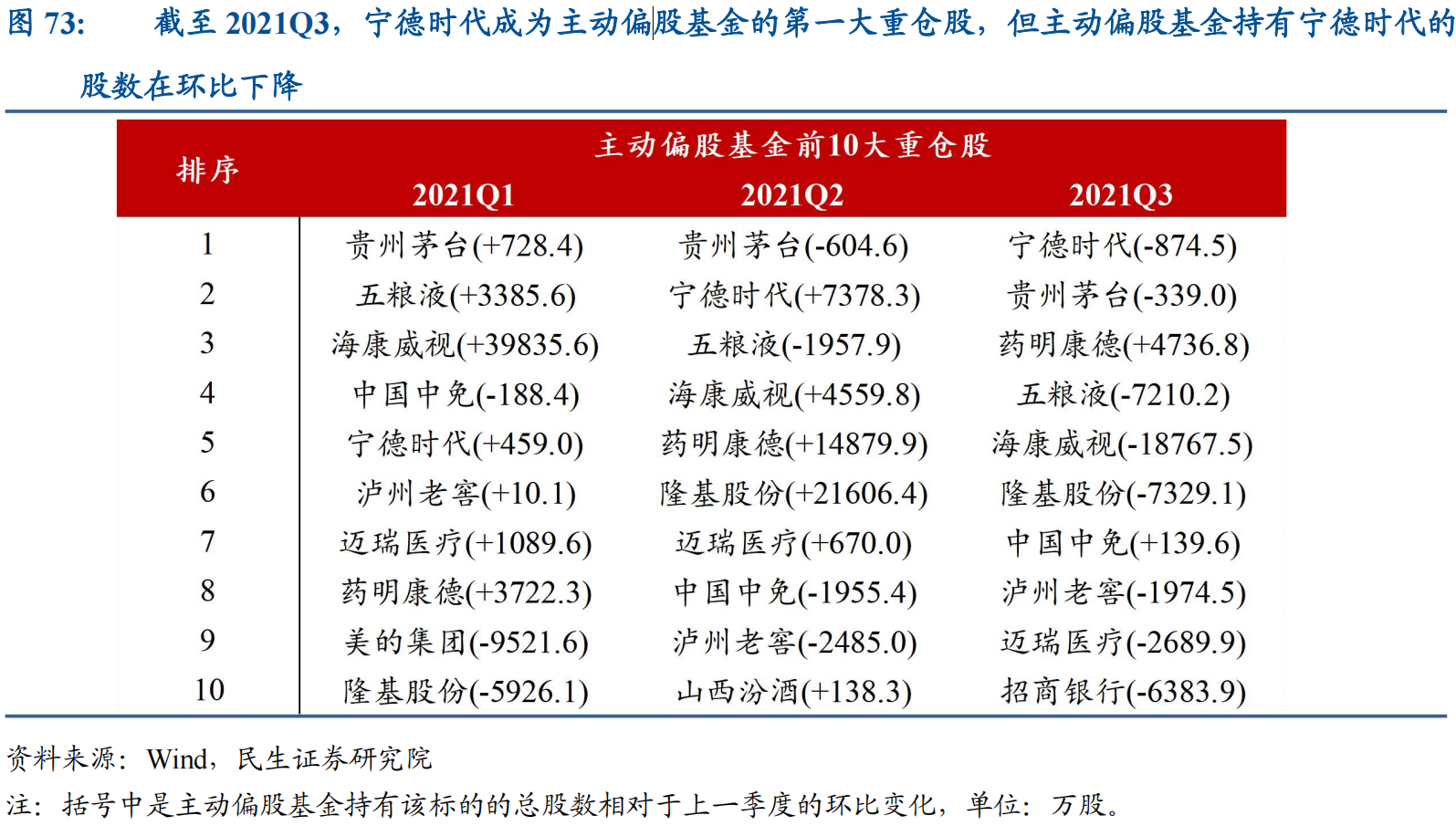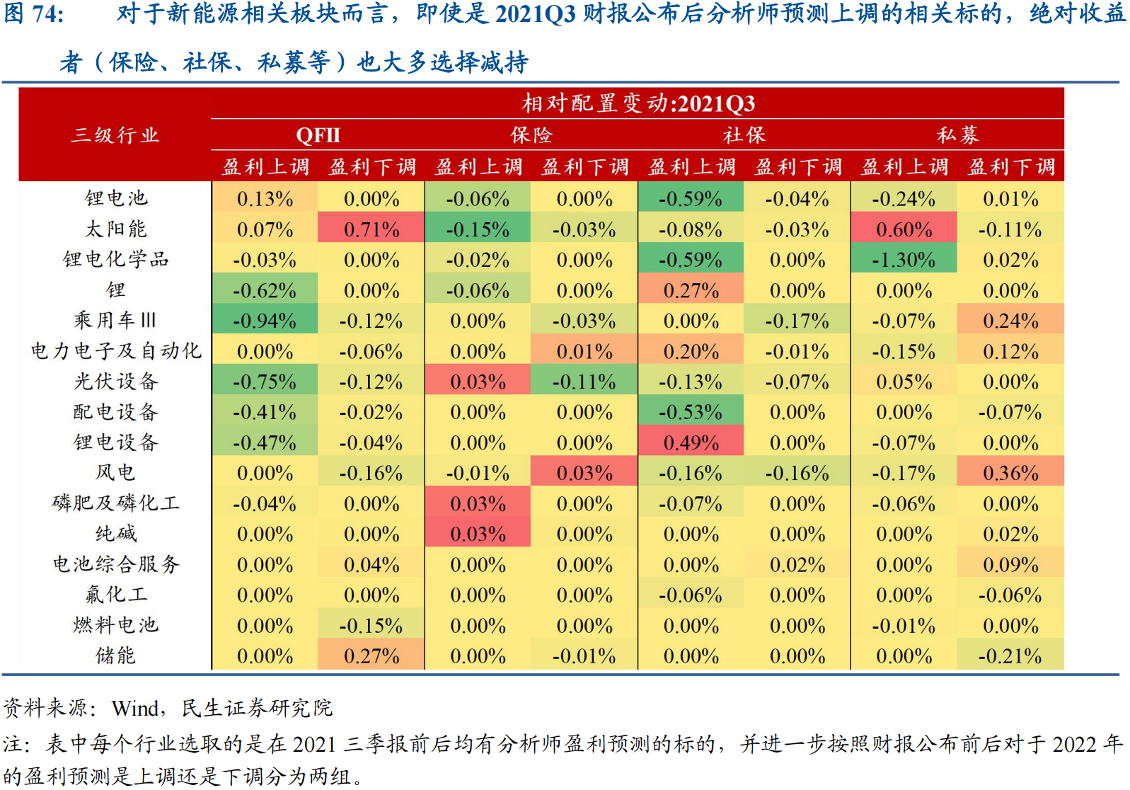 但值得一提的是,“宁王称王”背后,投资者层面的分歧也在逐步显现。2021Q3,宁德时代首次取代贵州茅台成为主动偏股基金的第一大重仓股,但主动偏股基金持有宁德时代的持股数量在环比下降,这意味着宁德时代“登顶”背后更有可能是源于被动因素,主动偏股基金本身对于宁德时代的分歧实际上也在逐步凸显。纳入其他投资者来看,如果按照2021Q3财报公布后分析师盈利的调整方向,将新能源细分板块分为业绩上调组和业绩下调组,我们发现:即使是新能源相关板块中的业绩上调组,绝对收益投资者(保险、社保、私募等)也大多选择减持,这意味着当前部分绝对收益投资者(保险、社保、私募等)对于新能源板块的分歧同样可能在显现。