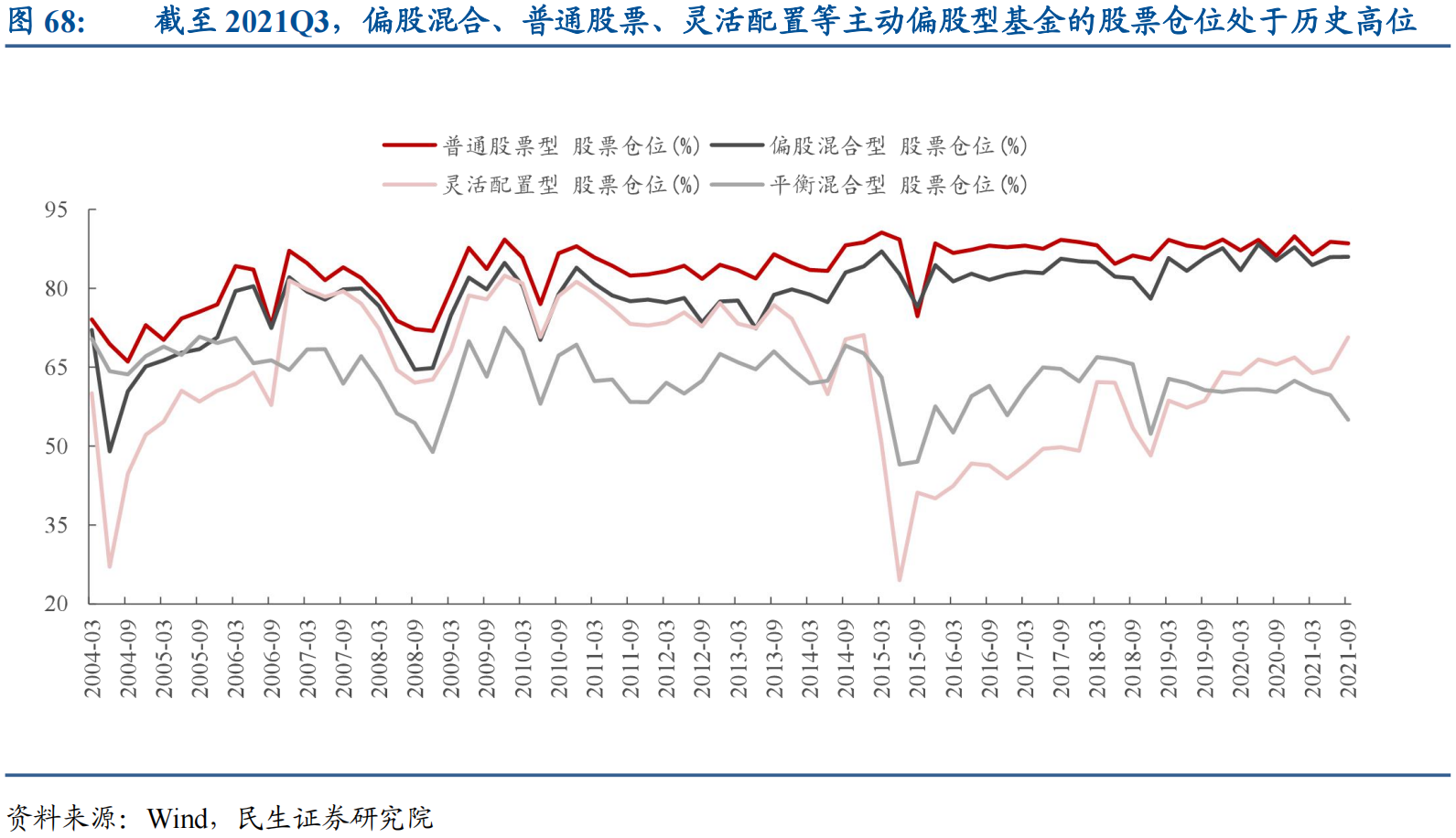 当前主动偏股基金仓位较高,负债端增量资金趋缓。一方面,截至2021Q3,偏股混合、普通股票、灵活配置等主动偏股型基金的股票仓位处于历史高位,特别是灵活配置型基金,其仓位处于2015年以来的最高位;另一方面,2021Q4以来(截至11月末),无论是股票型基金还是混合型基金的发行规模都相对较弱。这意味着当前可能处于一个相对存量的市场。