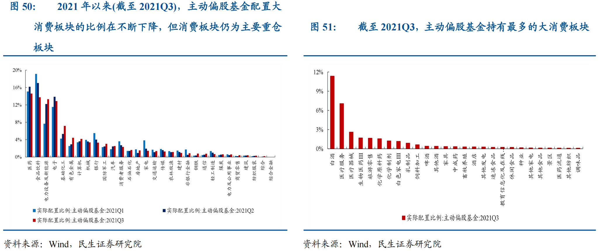 2021年以来,主动偏股基金对于大消费板块(医药、食品饮料、消费者服务等)的配置比例在不断下降,而在新能源相关板块(电新、化工、有色等)的配置比例提升,但截至2021Q3,大消费板块仍未主动偏股基金的主要重仓板块,更进一步地,从大消费板块的细分领域上看,截至2021Q3,主动偏股基金持有最多的为白酒、医疗服务、医疗器械、生物医药、旅游零售等板块。这意味着主流机构投资者尽管重仓消费板块,但是需要为结构的切换作更多准备。