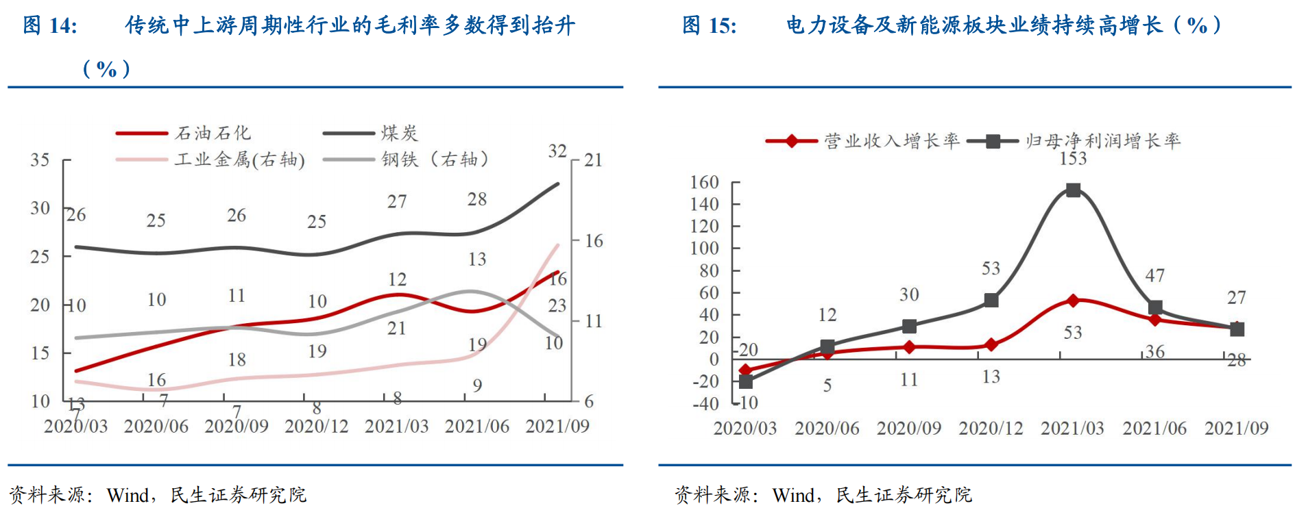 而碳中和使得传统行业的这一趋势被近一步确立,企业远期预期的改变也让资本涌入新能源系统之中,导致了新能源系统建设时企业的投入可以被定价为产能的增长而传统行业的高毛利则继续享受盈利改善,从而支持其低碳改造和产业转型。因此,2005-2007的周期股的两大属性被一分为二,传统行业享受高毛利,而新兴行业享受高的产能成长。这一特征,带来了2021年5月以后在经济周期回落中,新能源和周期行情的此起彼伏。