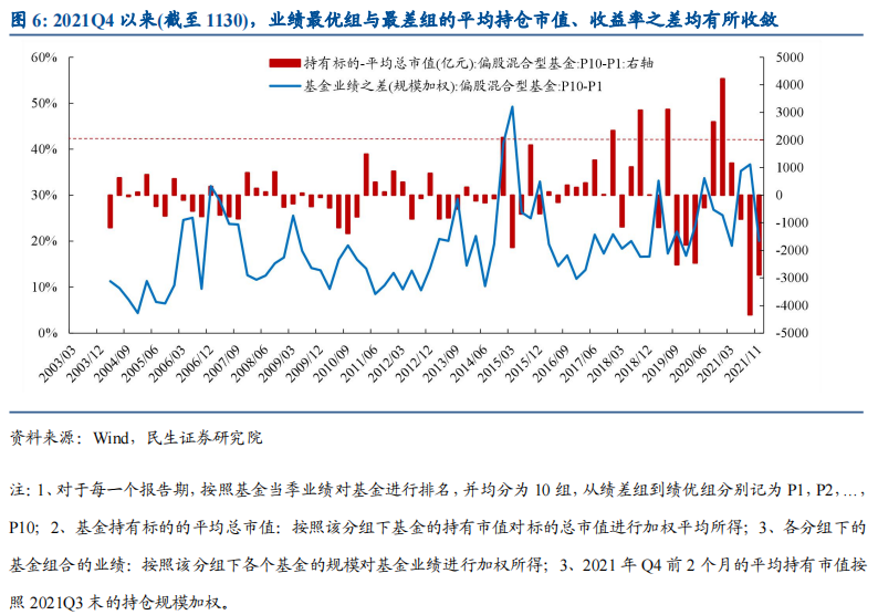 2020Q4以来,偏股混合型基金中业绩最好组与最差组的平均持有市值之差从历史最高点,回落至2021Q3的历史最低点,同时,两者的业绩之差在2021Q3达到历史高位。2021Q4以来(截至1130),业绩最优组与最差组的平均持仓市值、收益率之差均有所收敛。