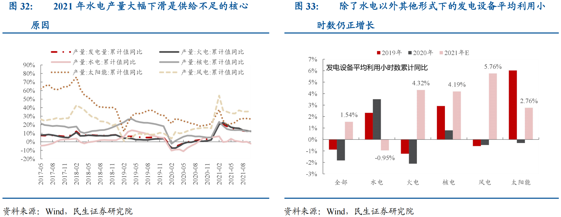 2021年电力短缺的核心原因在于需求端制造业/居民部门的用电需求增长超出了历史趋势,同时遇上水电发电大幅下滑,因此给火电以及其他可再生能源发电带来了较大的压力。