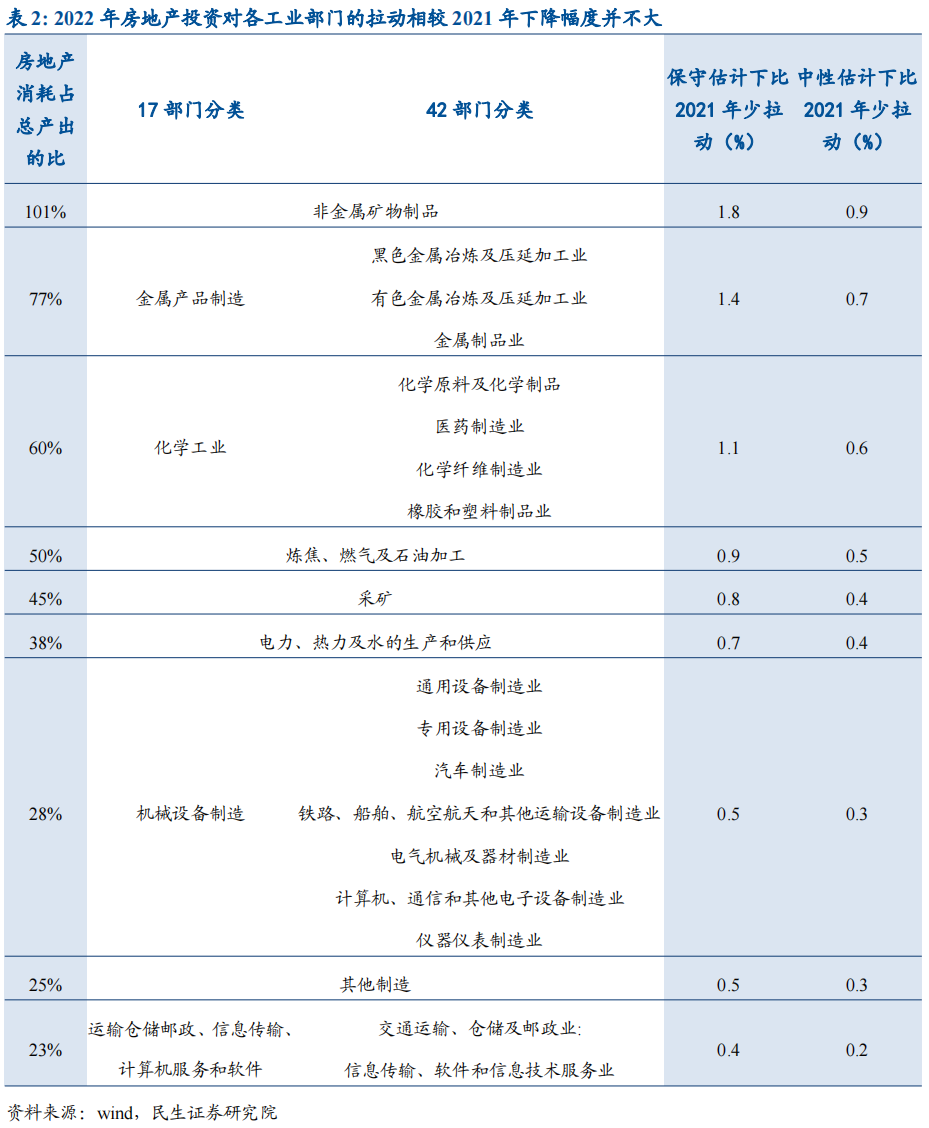 这样一来,“房地产下行将带来十年周期大顶”这种预期的基础则并不坚实。例如,我们在施工面积中性预测下,假设单位施工成本回落至2016年的水平,则2022年房地产投资额(除土地购置)的增速将为7.4%,相较同假设下的2021年预测值下降1.8个百分点,将这一增速乘以各行业需求对房地产投资的依赖度,我们将发现“拖累”最大不会超过1.8个百分点。如果假设单位施工成本维持在2021年的均价水平,2022年房地产投资额(除土地购置)增速为8.31%,相较2021E下降0.9个百分点。则对各行业的拉动相较2021年仅会减少不到1个百分点。