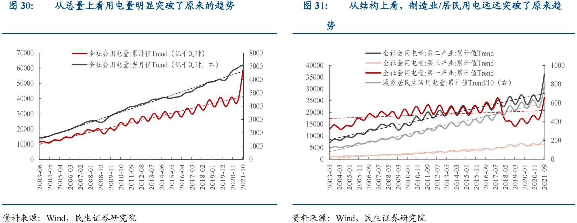 如果我们剔除周期性波动,看用电量的趋势项,则我们发现2021年的电力需求大增远非季节性可以解释:从总量上看趋势项明显突破了原来的增长趋势;从结构上看制造业/居民的用电远远突破了原来的趋势;采矿业还未达到2017年的历史高点,服务业的增幅也不是很明显。