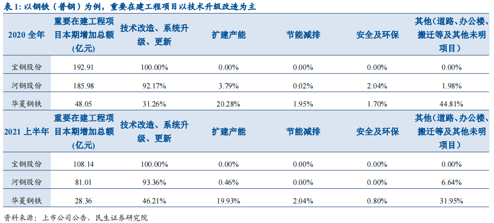 我们认为,正是能源转型+产业升级因素的存在,导致了全社会企业资本开支流动发生转移。对于传统行业而言,供给的约束使得开支意愿下降:2016年后,行业各自经历了自然出清+供给侧改革,产品价格下滑的趋势得到扭转,中枢逐渐上移,而新的产能投放几乎在2020年后结束,这让各行业产能利用率在2021年相继创下历史新高。尽管部分传统板块当前的资本开支并不低,然而根据上市公司披露的2021半年报明细和重大项目投资公告来看,其资本开支更多用于技术改造(低碳改造、环保改造)和新兴行业转型,而非扩建产能。