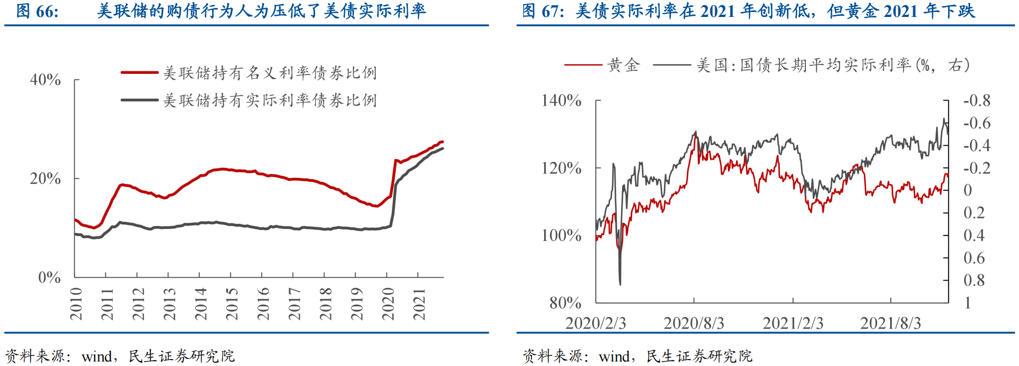 此外,美联储小力度的收紧也意味着黄金将迎来配置机会。2021年以来,美国实际利率创下新低,而黄金价格却在下跌。这背后的部分原因来自于美债实际利率被人为压低,疫情期间美联储持有的TIPS债券比例从10%上升至26%,说明相比于实际利率,黄金价格已经进入了收紧的预期。2022年美联储货币政策小幅收紧将会导致美债长端利率上涨不足,叠加通胀预期较高,实际利率上行动力不足。因此,黄金的压制因素已经基本解除,黄金将迎来配置机会。