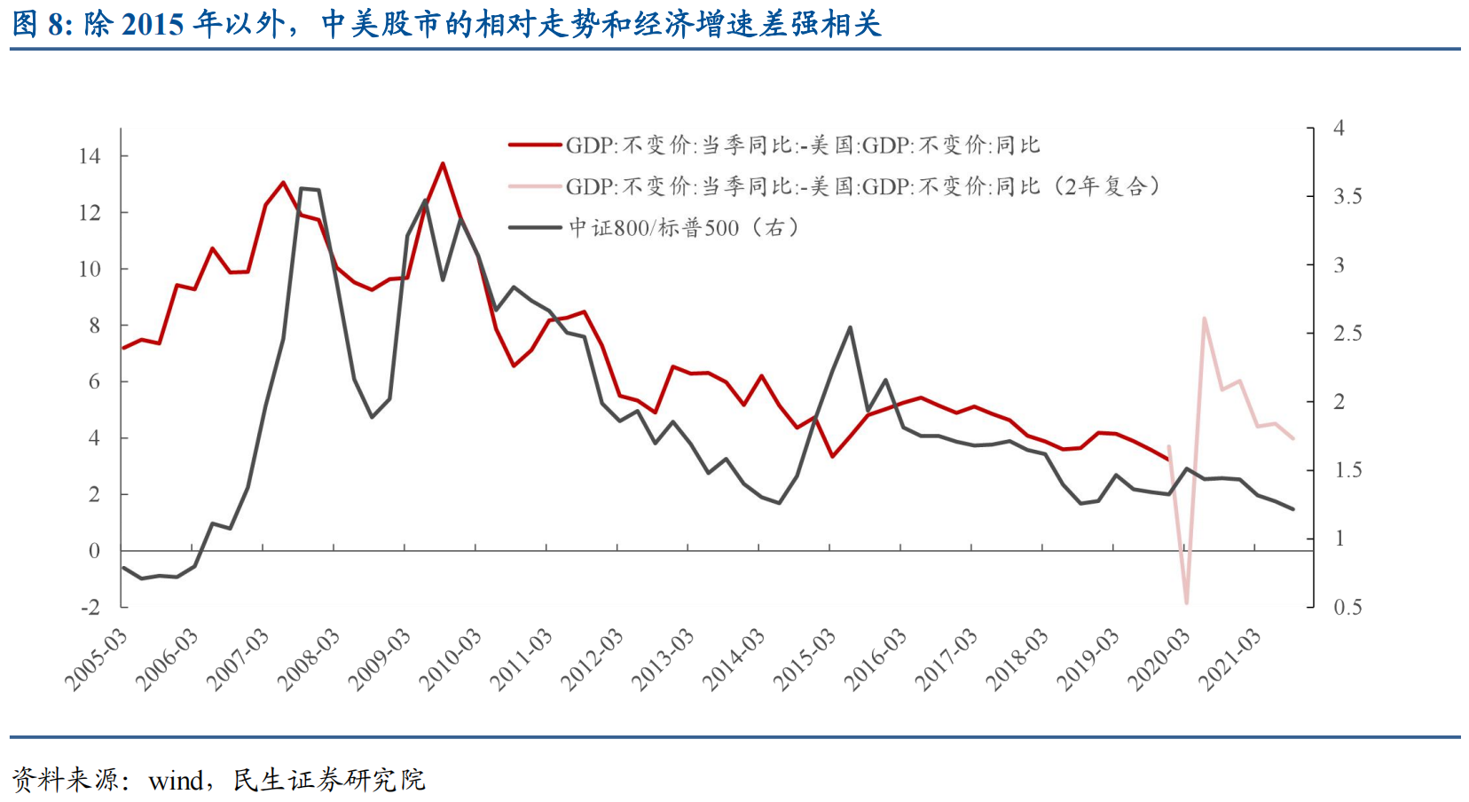 与2021年A股走势不同,2021年美国继续上涨,标普500相对中证800出现了明显的跑赢,符合历史基本面规律。历史上来看,除了2015牛市期间之外,A股和美股的相对表现与两国之间的经济增速差高度相关,其中股市的相对表现可能提前于基本面。2021年标普500相对中证800明显跑赢,符合两国经济增速差收窄的基本面事实。