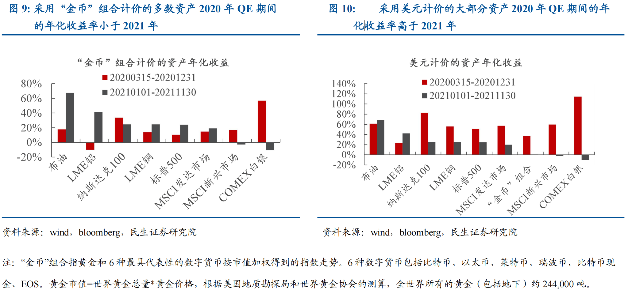 同时,与2020年不同,2021年的海外风险资产上涨并非依靠天量的流动性,而是一个基本面牛市。为了剔除货币政策对资产价格的影响,我们计算采用黄金和数字货币加权得到的“金币”组合,作为实际货币对资产进行计价,并和美元计价的资产走势进行对比。采用美元计价的大部分资产2020年QE期间的年化收益率高于2021年截止11月底的年化收益率,而采用“金币”组合计价的多数资产2020年QE期间的年化收益率小于2021年截止11月底的年化收益率,说明市场在2020年更多是流动性驱动的上涨,而在2021年更多是基本面修复的上涨。