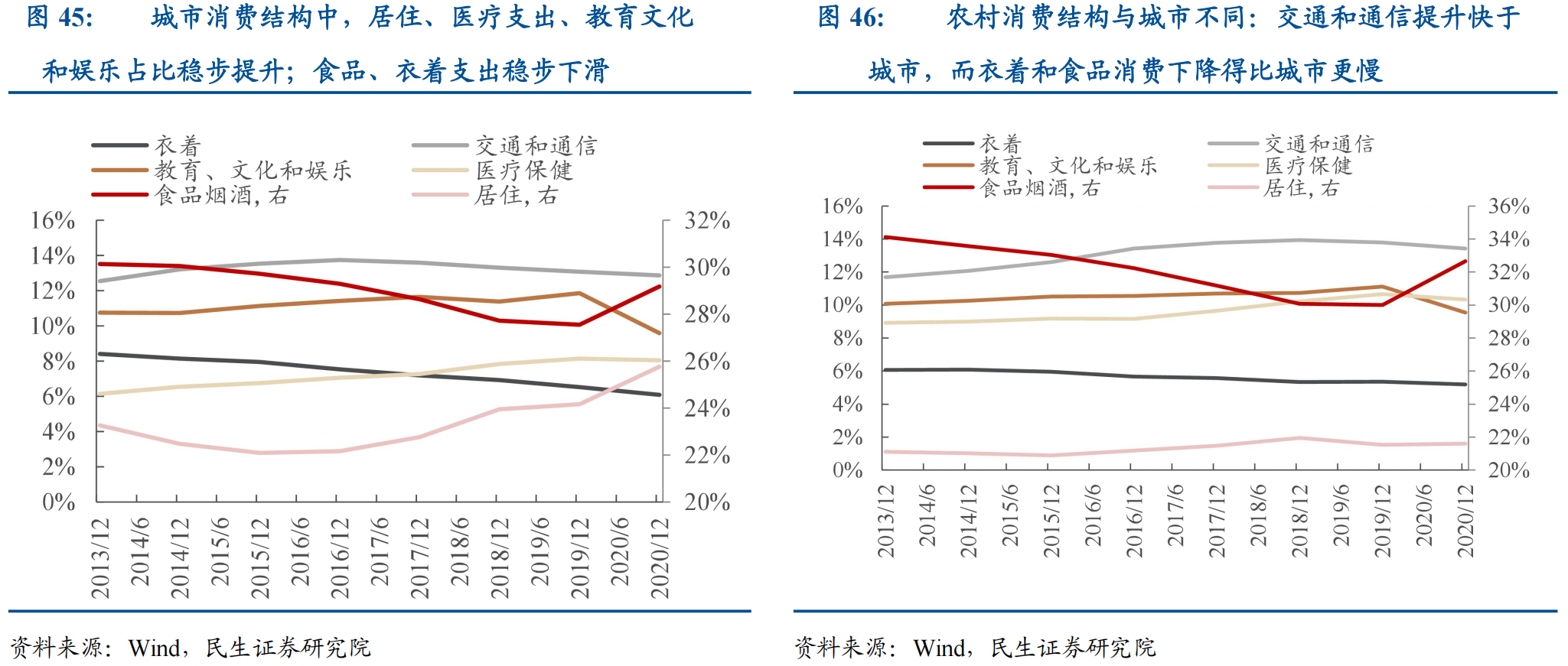 而当前农村消费水平及收入水平绝对值与2010年的城镇居民水平相近,与当下城镇居民的消费结构显著不同。往后看,农村收入及消费水平相对城镇更快速地提高则意味着全社会的消费将进行重新的一次“升级”,相关的领域与此前所理解的“消费升级”并不重合。当前来看,农村与城市不同的是其居住成本提升慢,为其它的消费的增长提供了空间,例如:交通和通信提升快于城市;而衣着和食品消费下降得比城市更慢;而未来教育、文化和娱乐占比仍有提升空间。