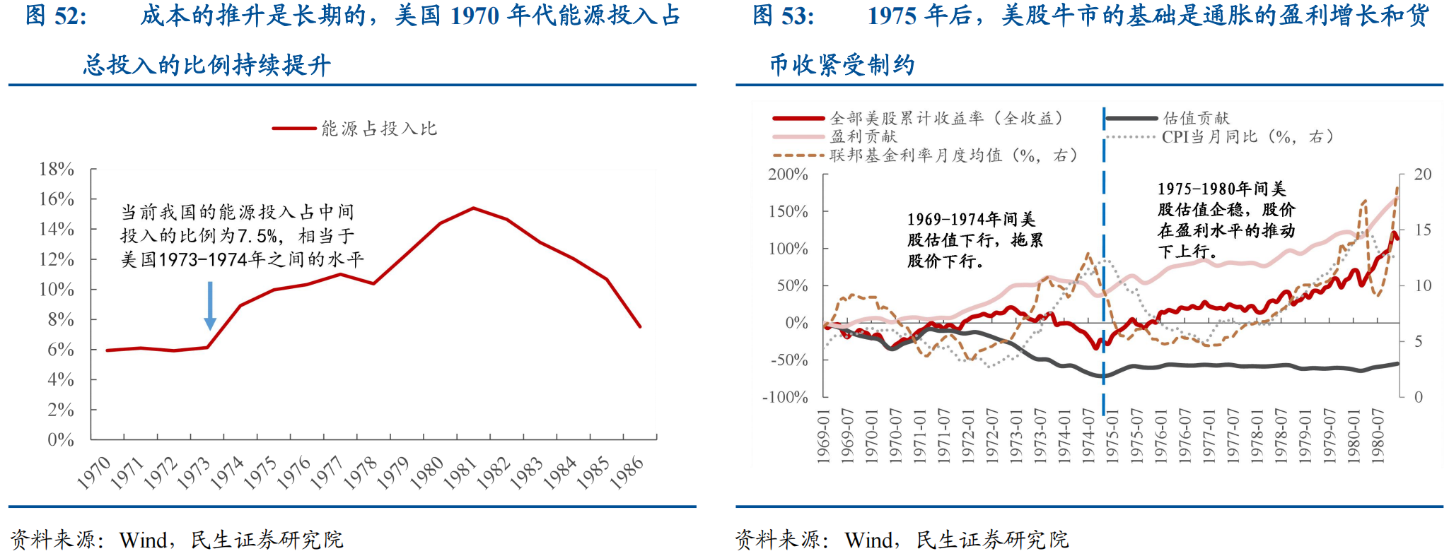 以美国20世纪70年代为例,1975年从衰退走向复苏的过程中,即使第一次石油危机的供给冲击已经过去,此时成本推升也仍然存在;而货币政策受制于经济增长和就业率无法相应地收紧。在通胀弹性强于经济弹性的时期,市场表现以盈利贡献为主,估值稳定为辅。